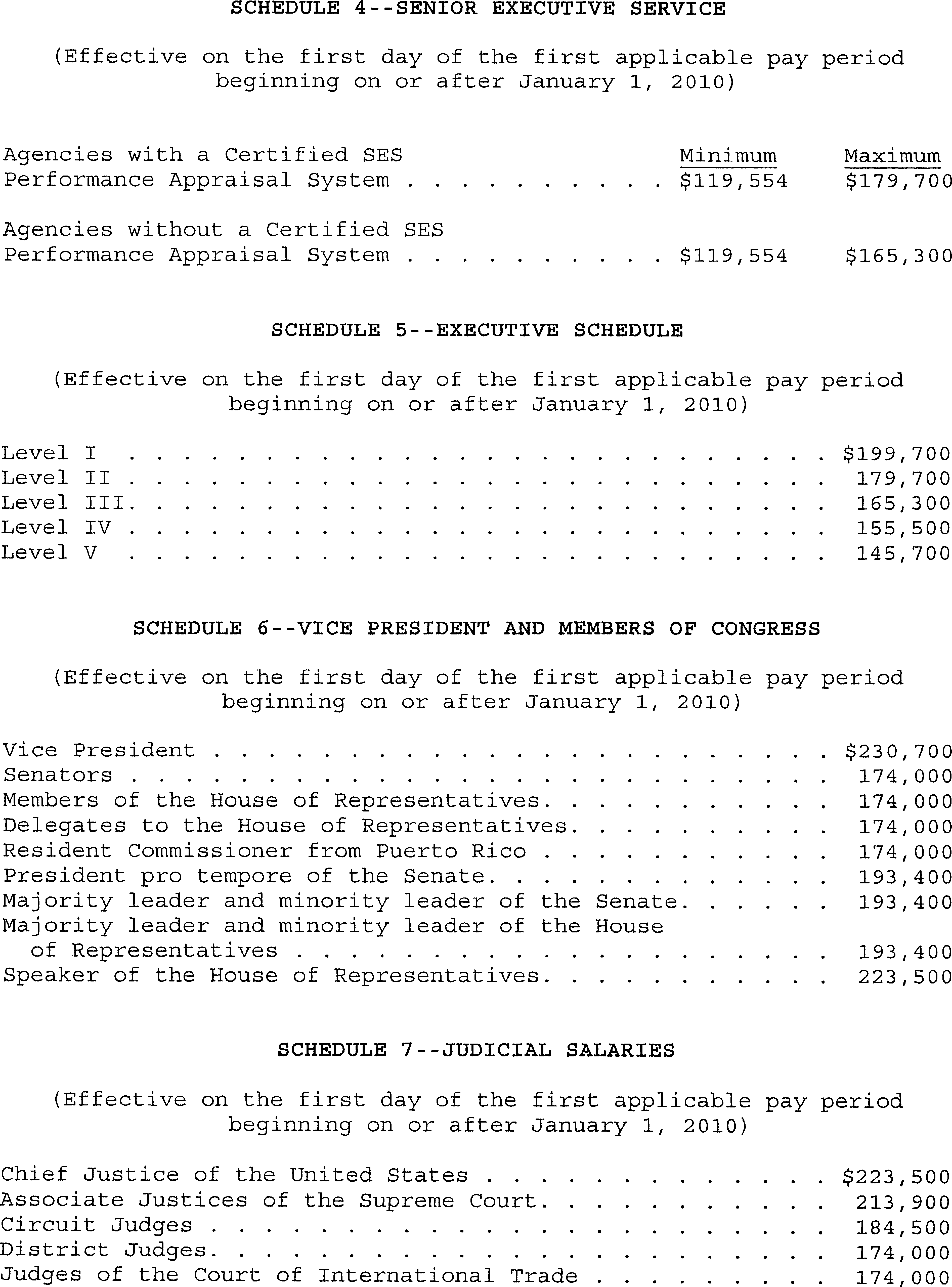 Section 1. Statutory Pay Systems. The rates of basic pay or salaries of the statutory pay systems (as defined in 5 U.S.C. 5302(1)), as adjusted under 5 U.S.C. 5303 and section 744 of Division C of the Consolidated Appropriations Act, 2010 (Public Law 111-117, December 16, 2009), are set forth on the schedules attached hereto and made a part hereof: