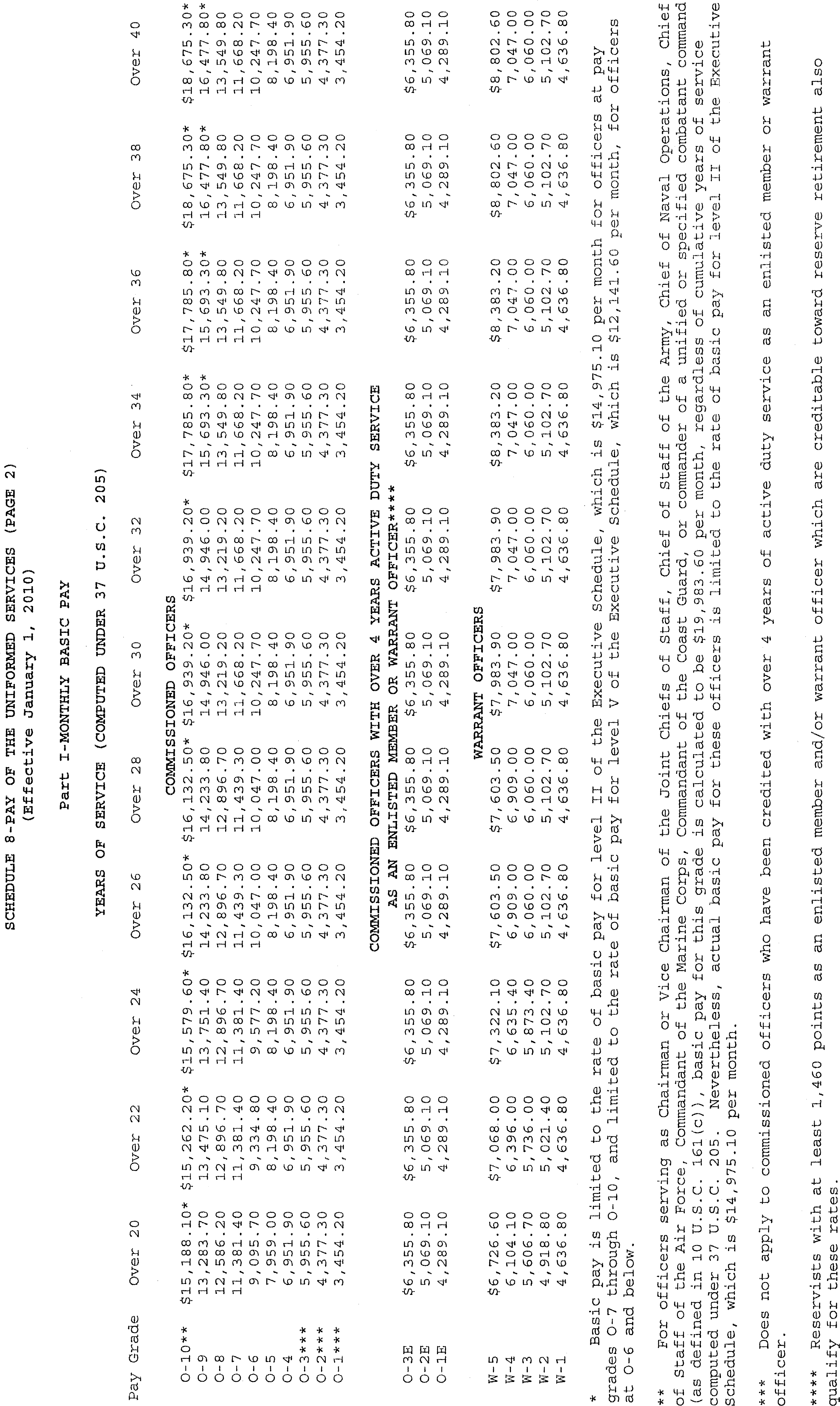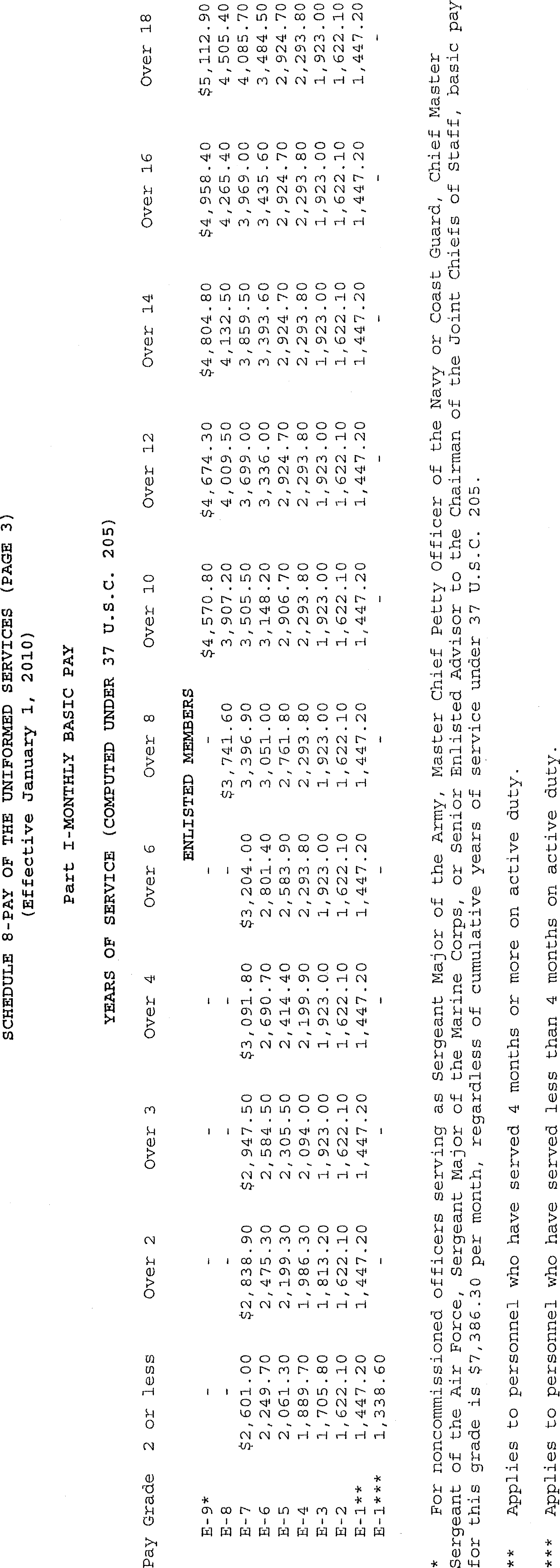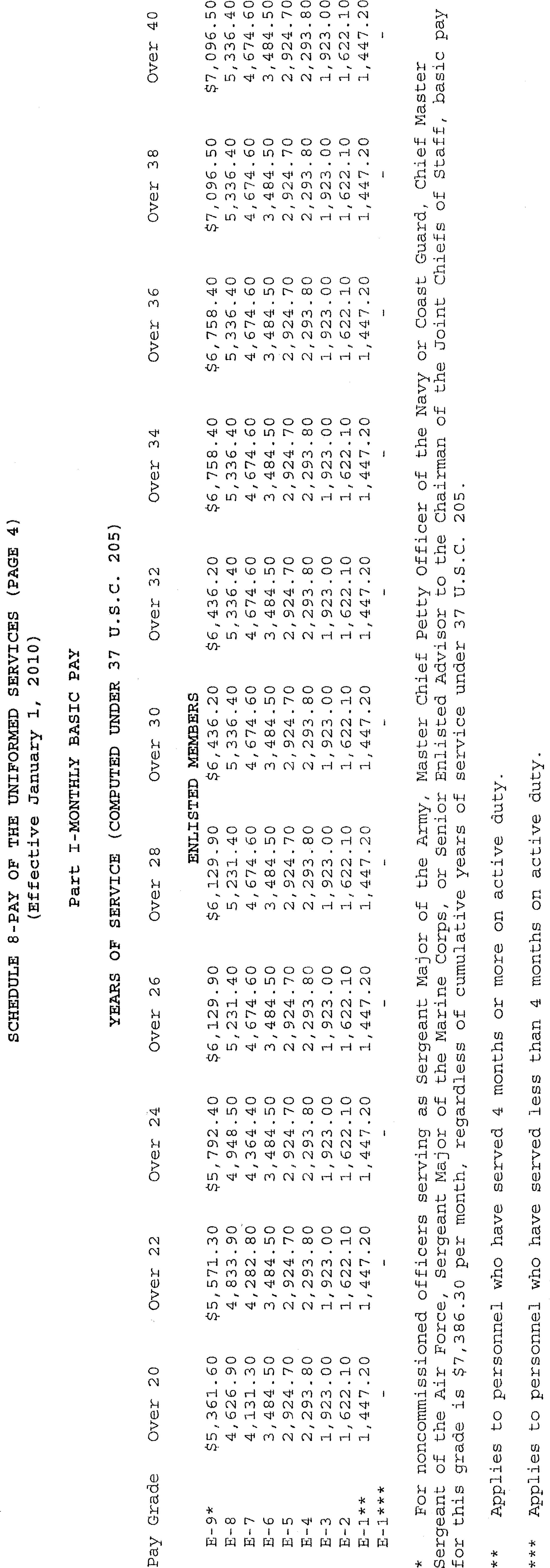 Sec. 4. Uniformed Services. The rates of monthly basic pay (37 U.S.C. 203(a)) for members of the uniformed services, as adjusted under 37 U.S.C. 1009, and section 601 of the National Defense Authorization Act for Fiscal Year 2010 (Public Law 111-84, October 28, 2009), and the rate of monthly cadet or midshipman pay (37 U.S.C. 203(c)) are set forth on Schedule 8 attached hereto and made a part hereof.
