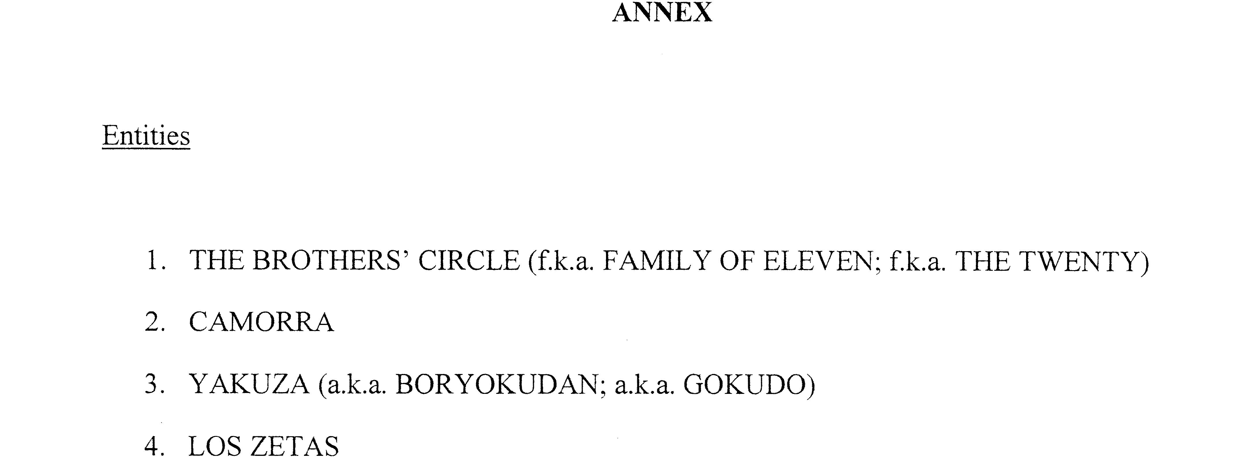 (e) the term “significant transnational criminal organization” means a group of persons, such as those listed in the Annex to this order, that includes one or more foreign persons; that engages in an ongoing pattern of serious criminal activity involving the jurisdictions of at least two foreign states; and that threatens the national security, foreign policy, or economy of the United States.