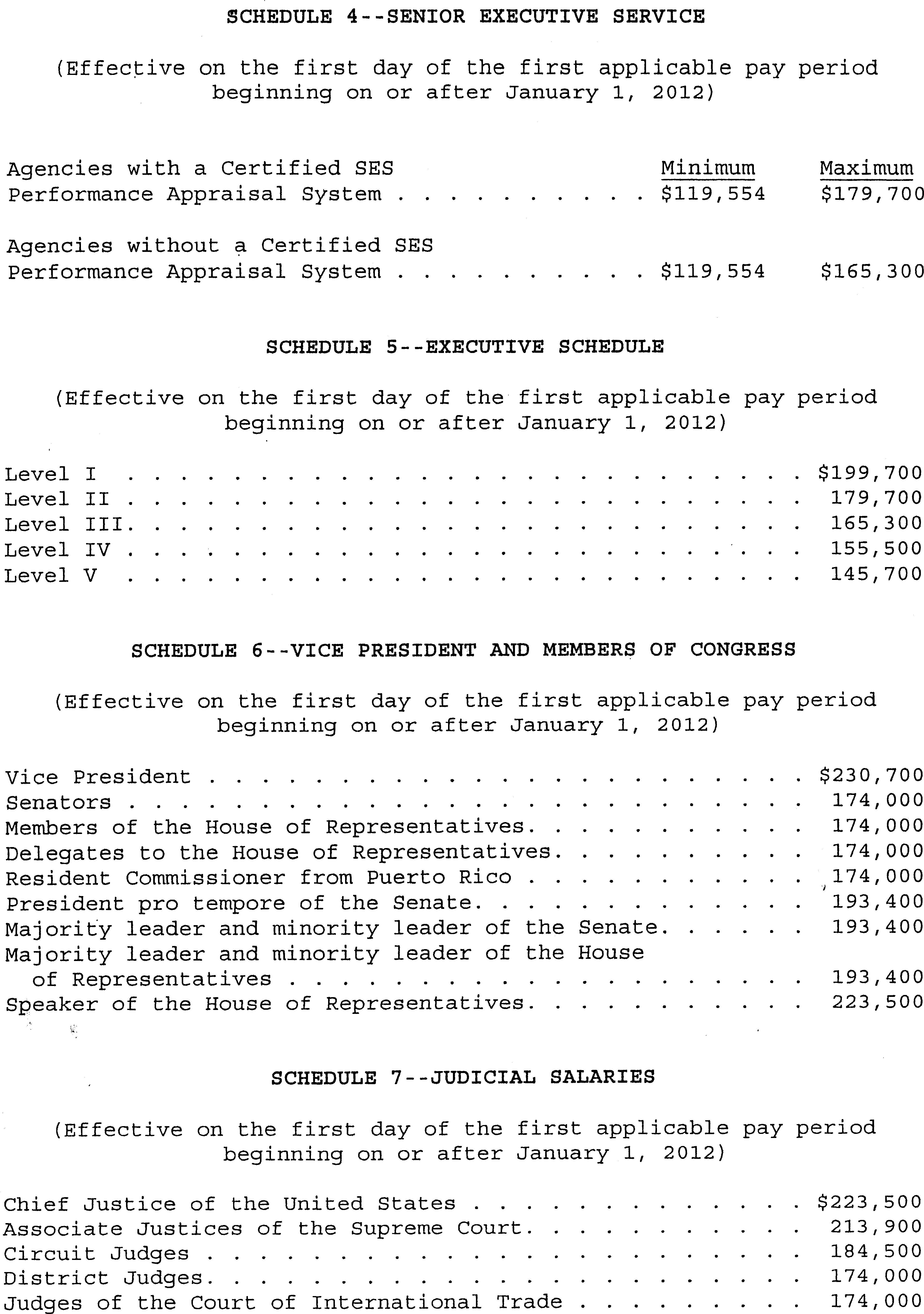 Sec. 2. Senior Executive Service. The ranges of rates of basic pay for senior executives in the Senior Executive Service, as established pursuant to 5 U.S.C. 5382, are set forth on Schedule 4 attached hereto and made a part hereof.