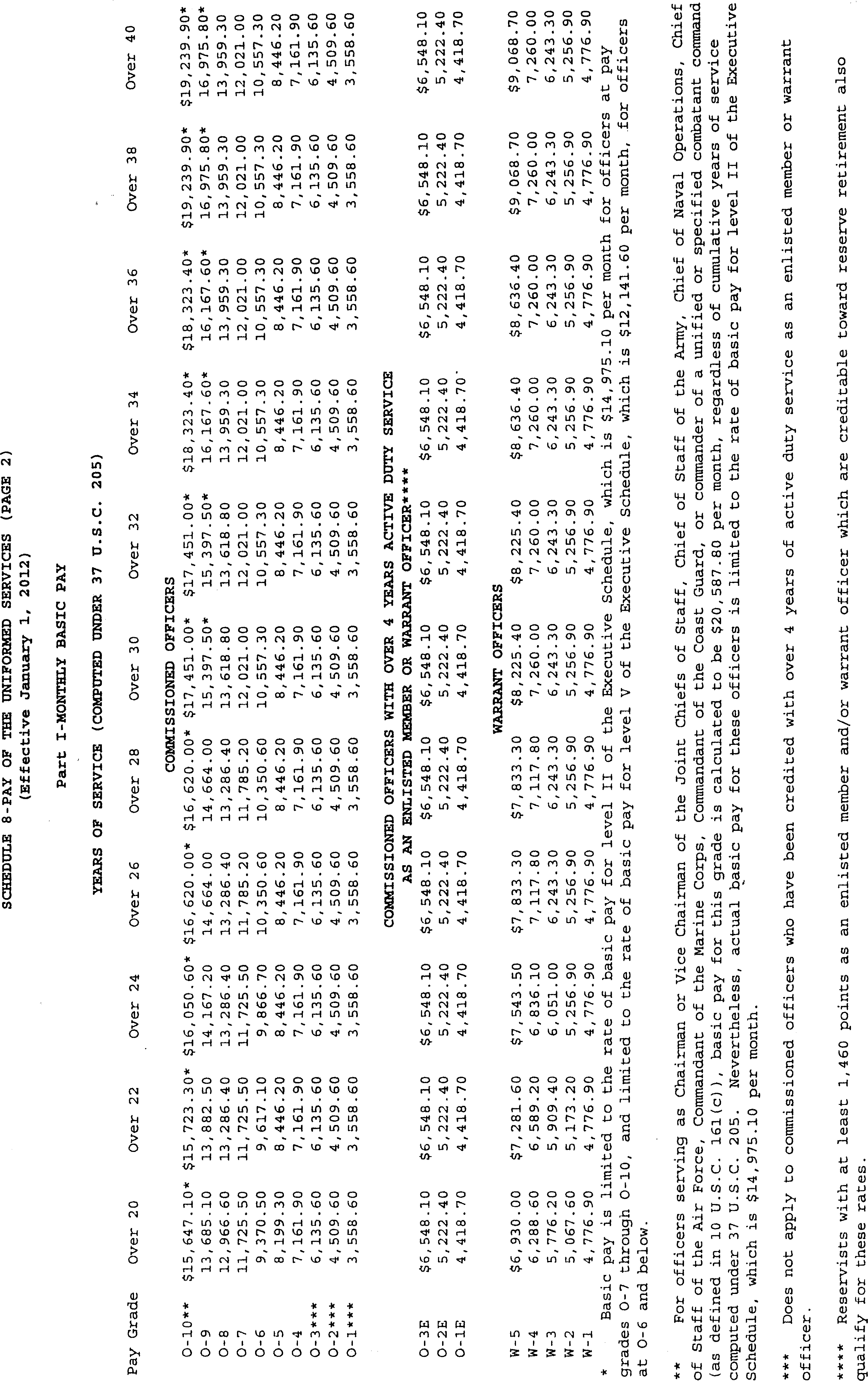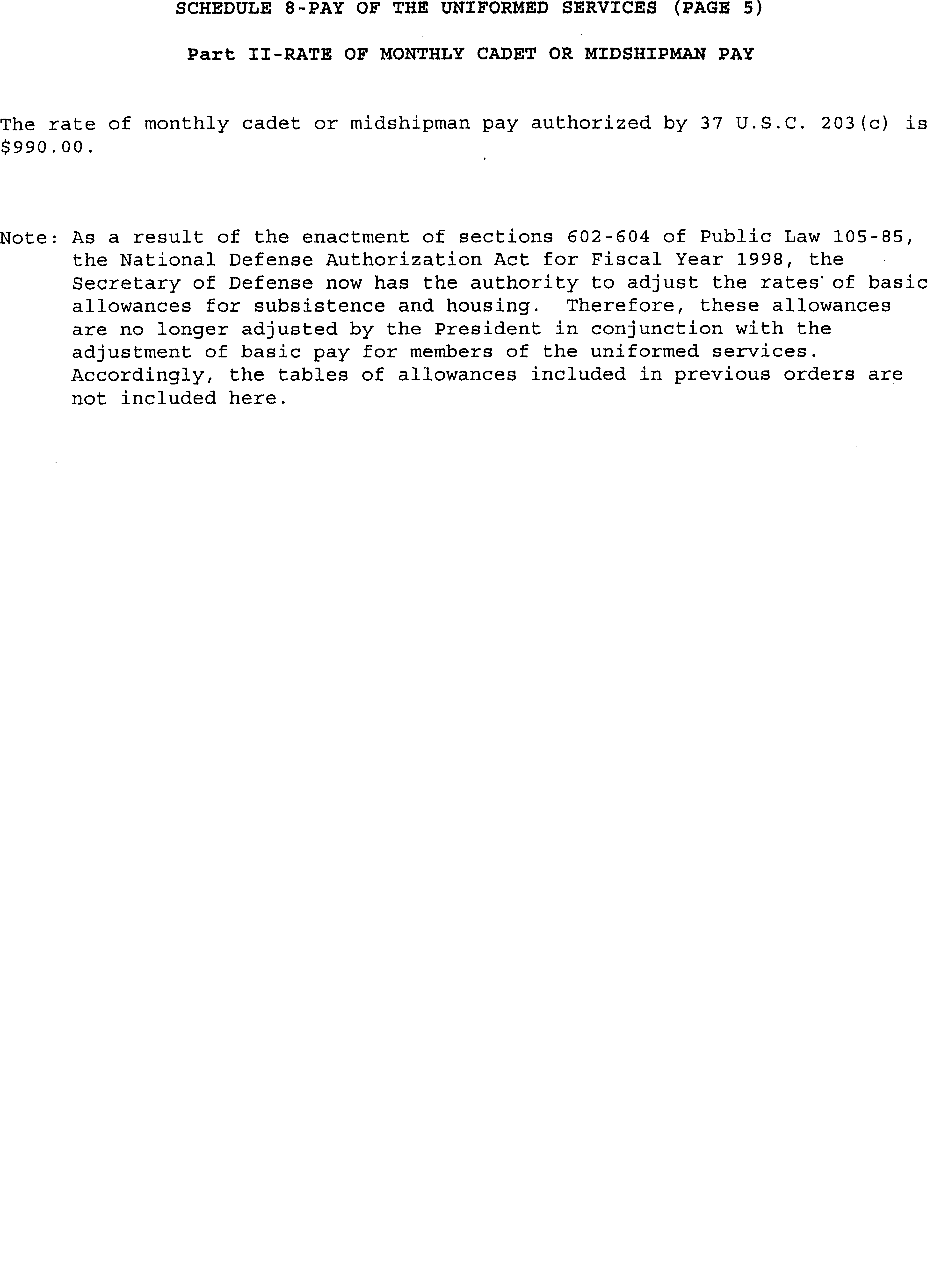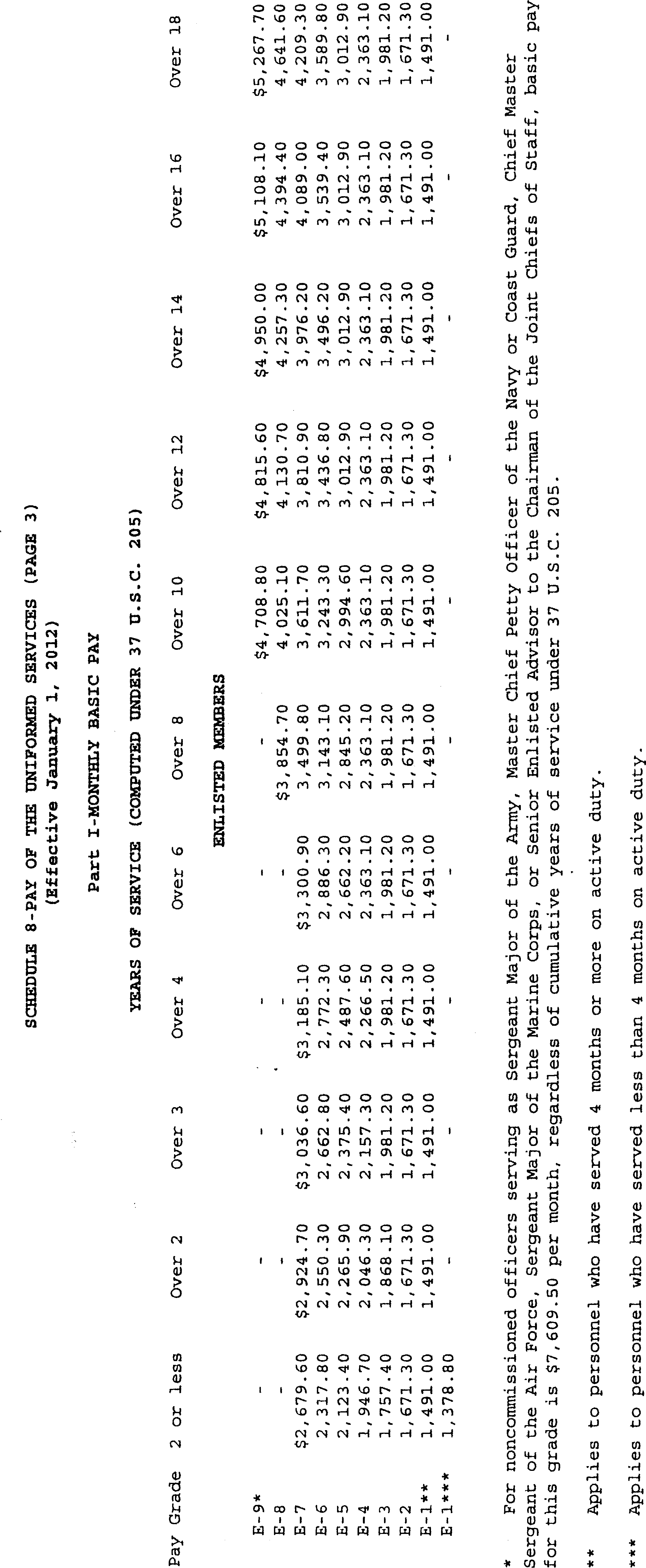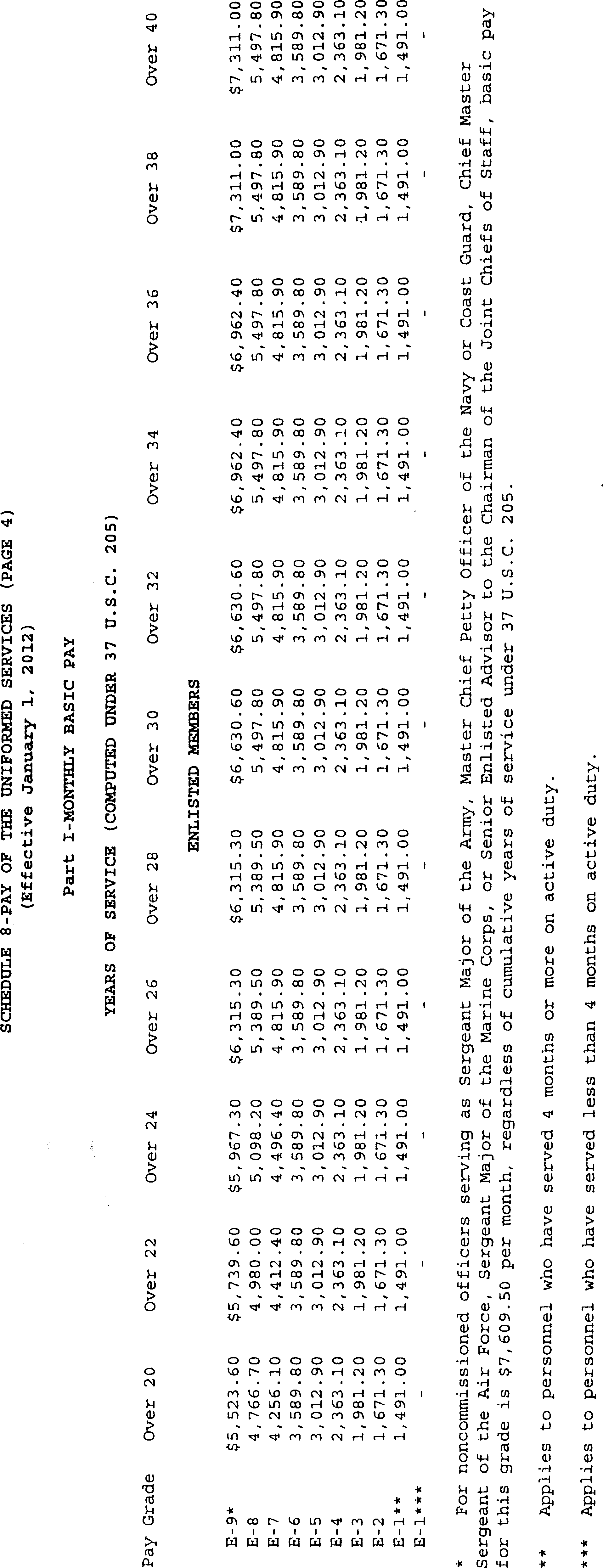 Sec. 4. Uniformed Services. The rates of monthly basic pay (37 U.S.C. 203(a)) for members of the uniformed services, as adjusted under 37 U.S.C. 1009, and the rate of monthly cadet or midshipman pay (37 U.S.C. 203(c)) are set forth on Schedule 8 attached hereto and made a part hereof.