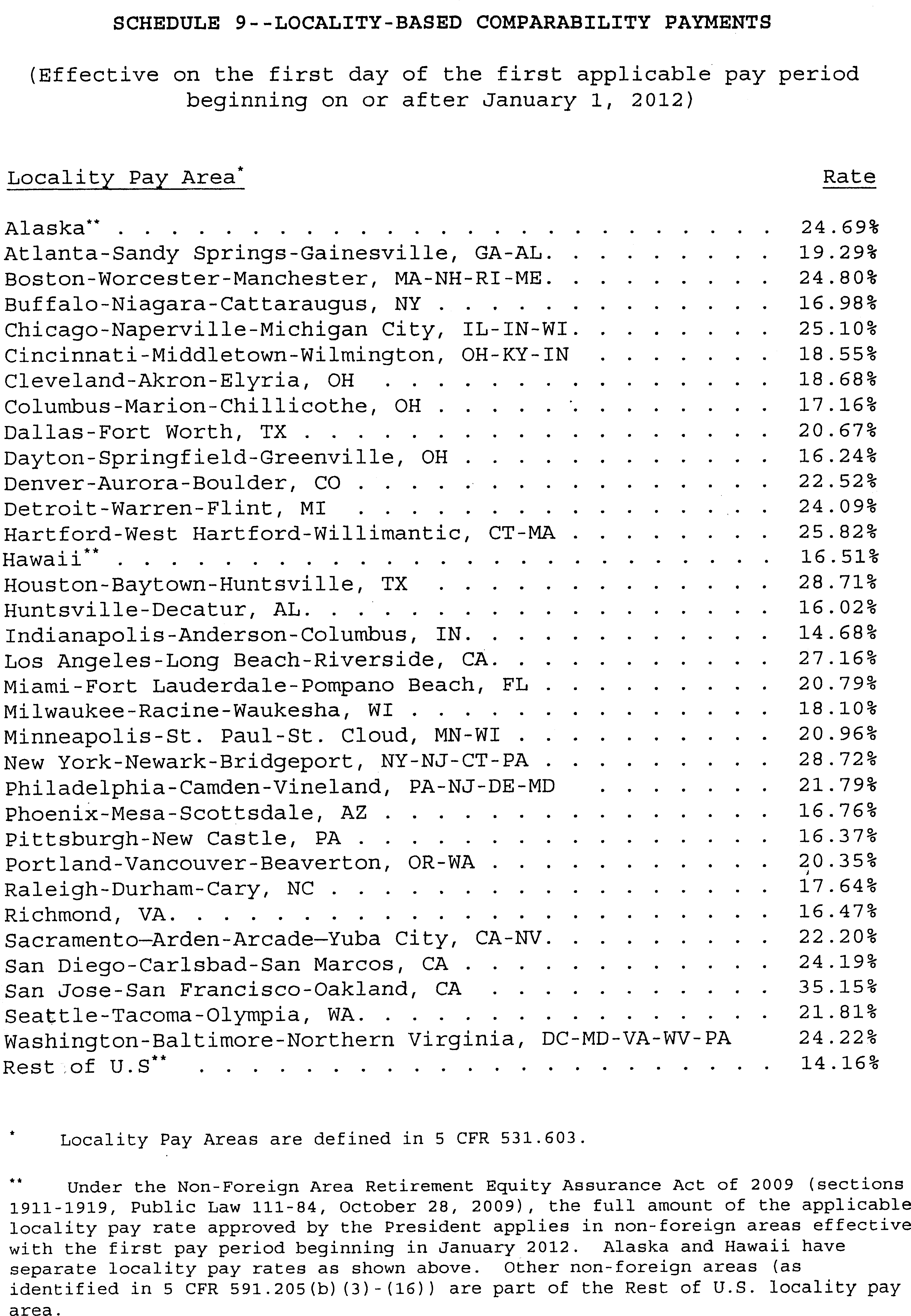 Sec. 5. Locality-Based Comparability Payments. (a) Pursuant to section 5304 of title 5, United States Code, the Non-Foreign Area Retirement Equity Assurance Act of 2009 (5 U.S.C. 5304 note), and the Continuing Appropriations and Surface Transportation Extensions Act, 2011(Public Law 111-322; December 22, 2010), locality-based comparability payments shall be paid in accordance with Schedule 9 attached hereto and made a part hereof.