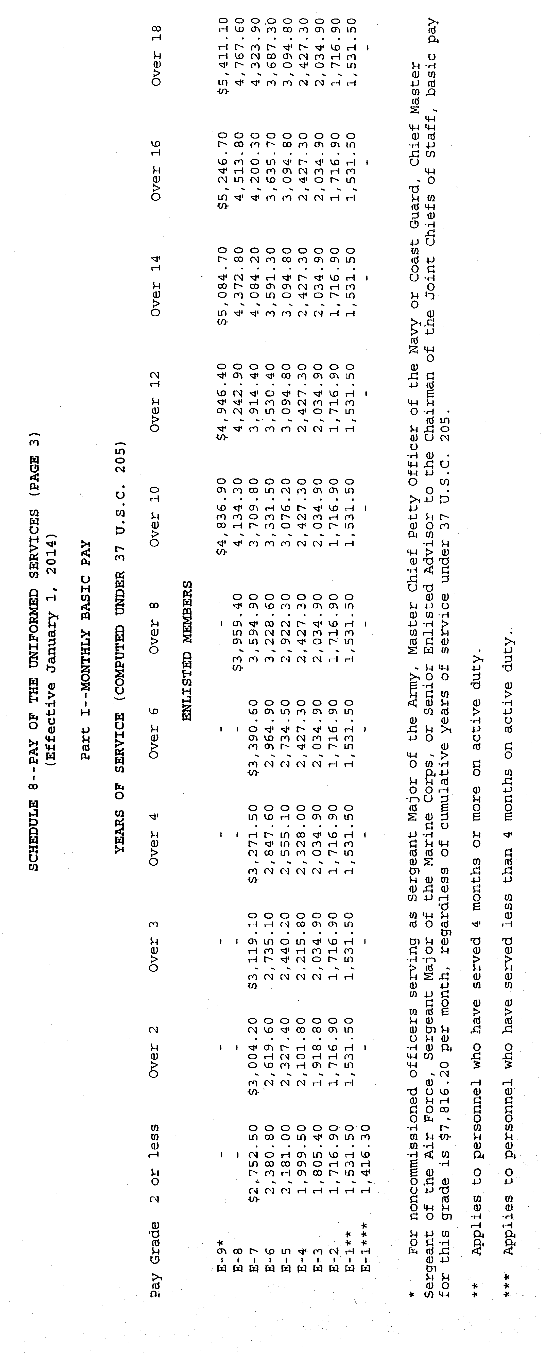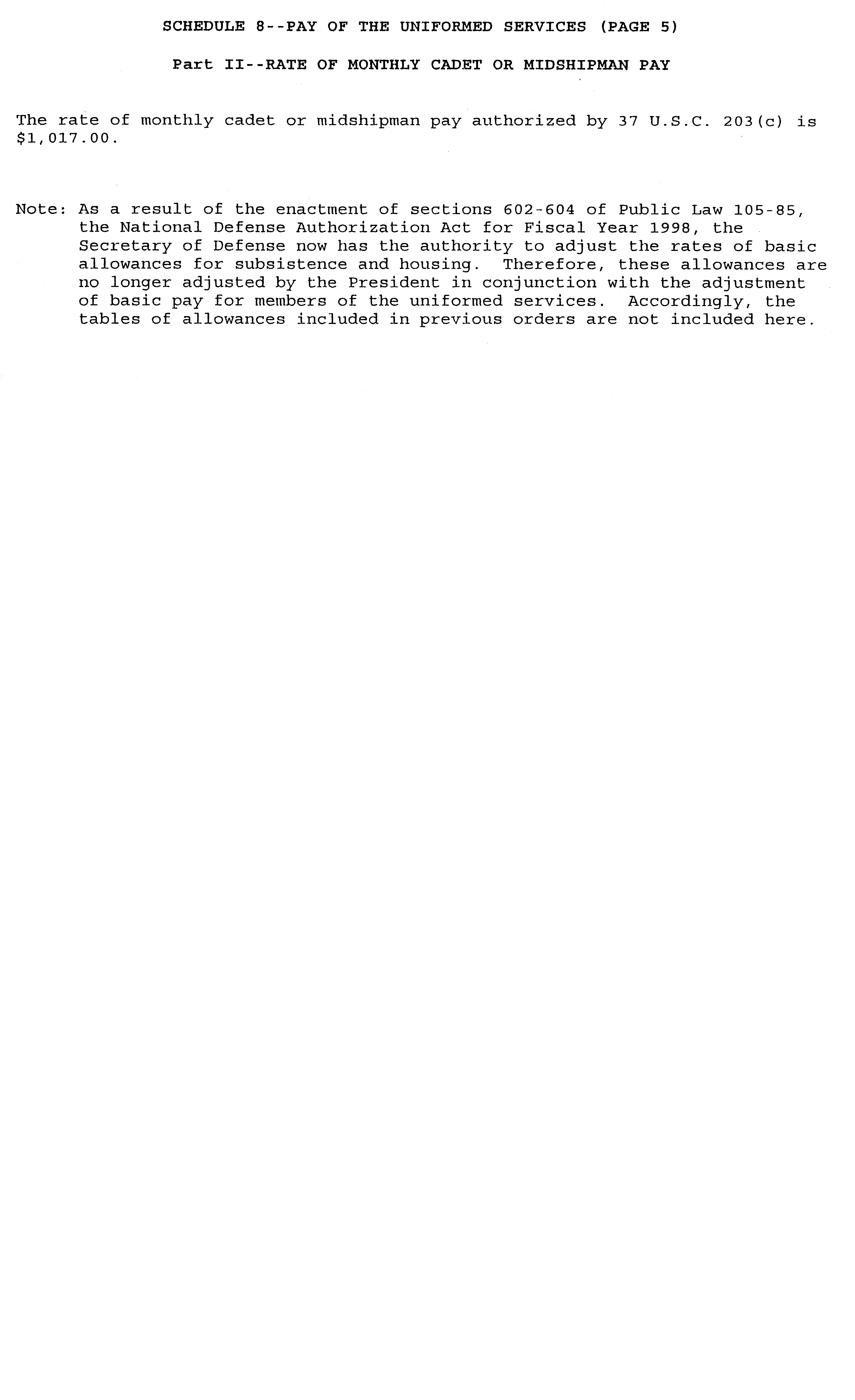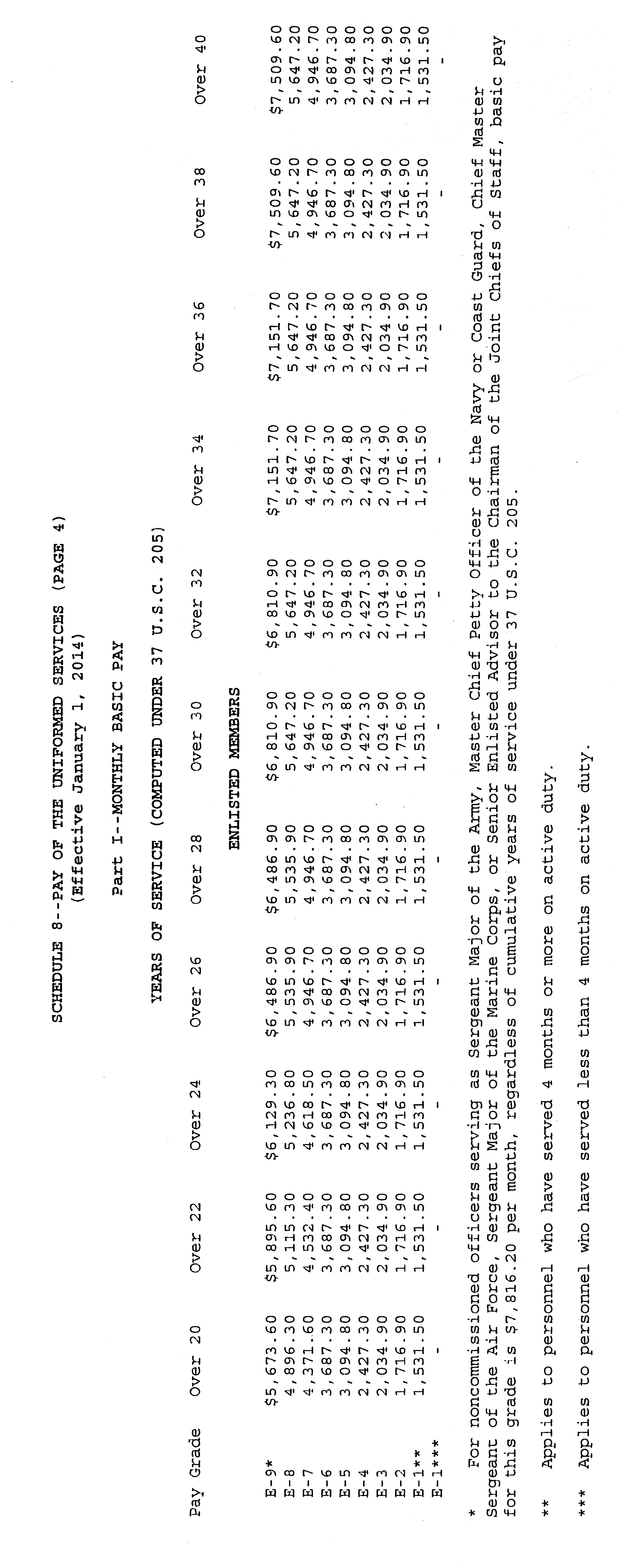 Sec. 4 . Uniformed Services. The rates of monthly basic pay (37 U.S.C. 203(a)) for members of the uniformed services, as adjusted under 37 U.S.C. 1009, and the rate of monthly cadet or midshipman pay (37 U.S.C. 203(c)) are set forth on Schedule 8 attached hereto and made a part hereof.
