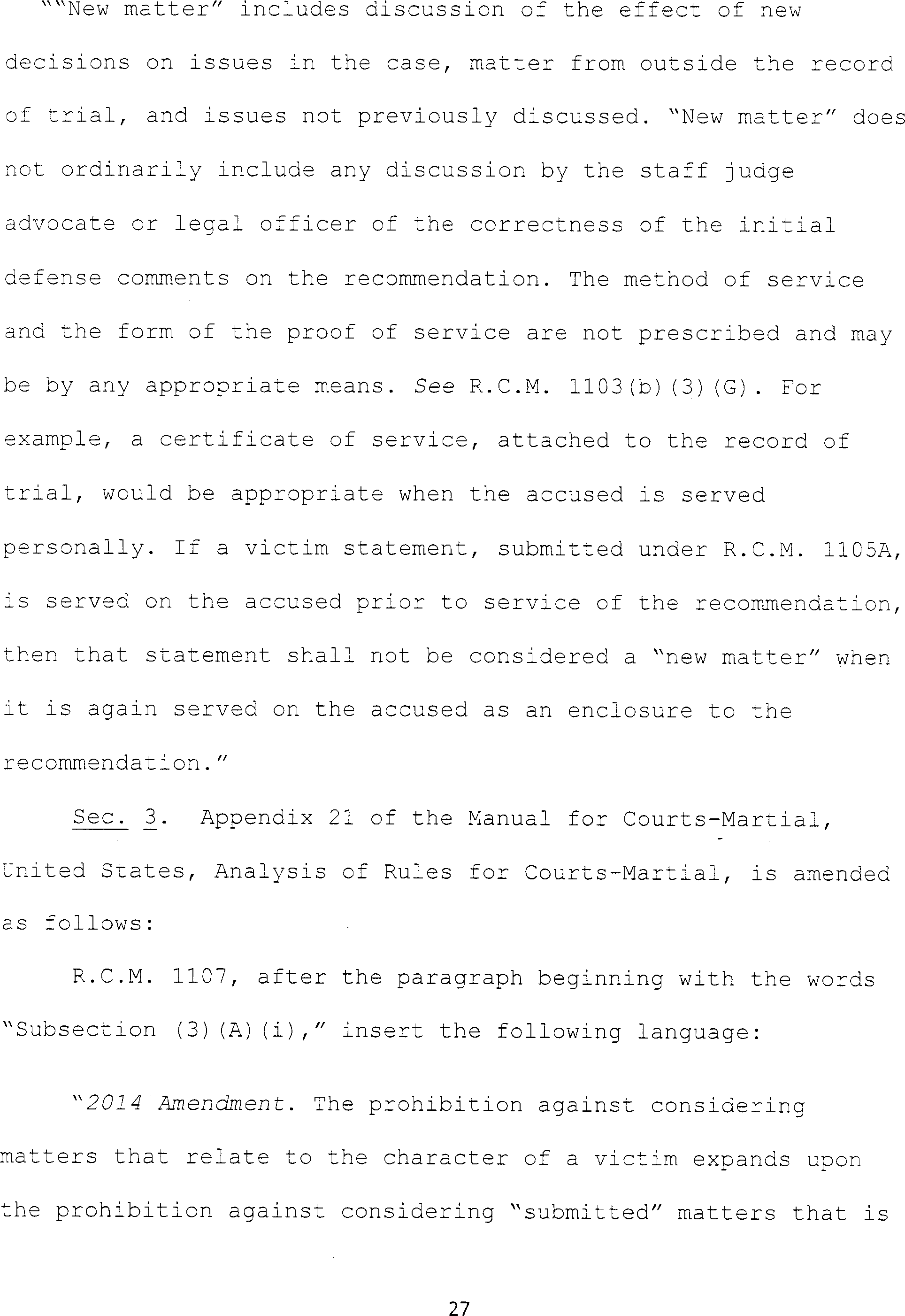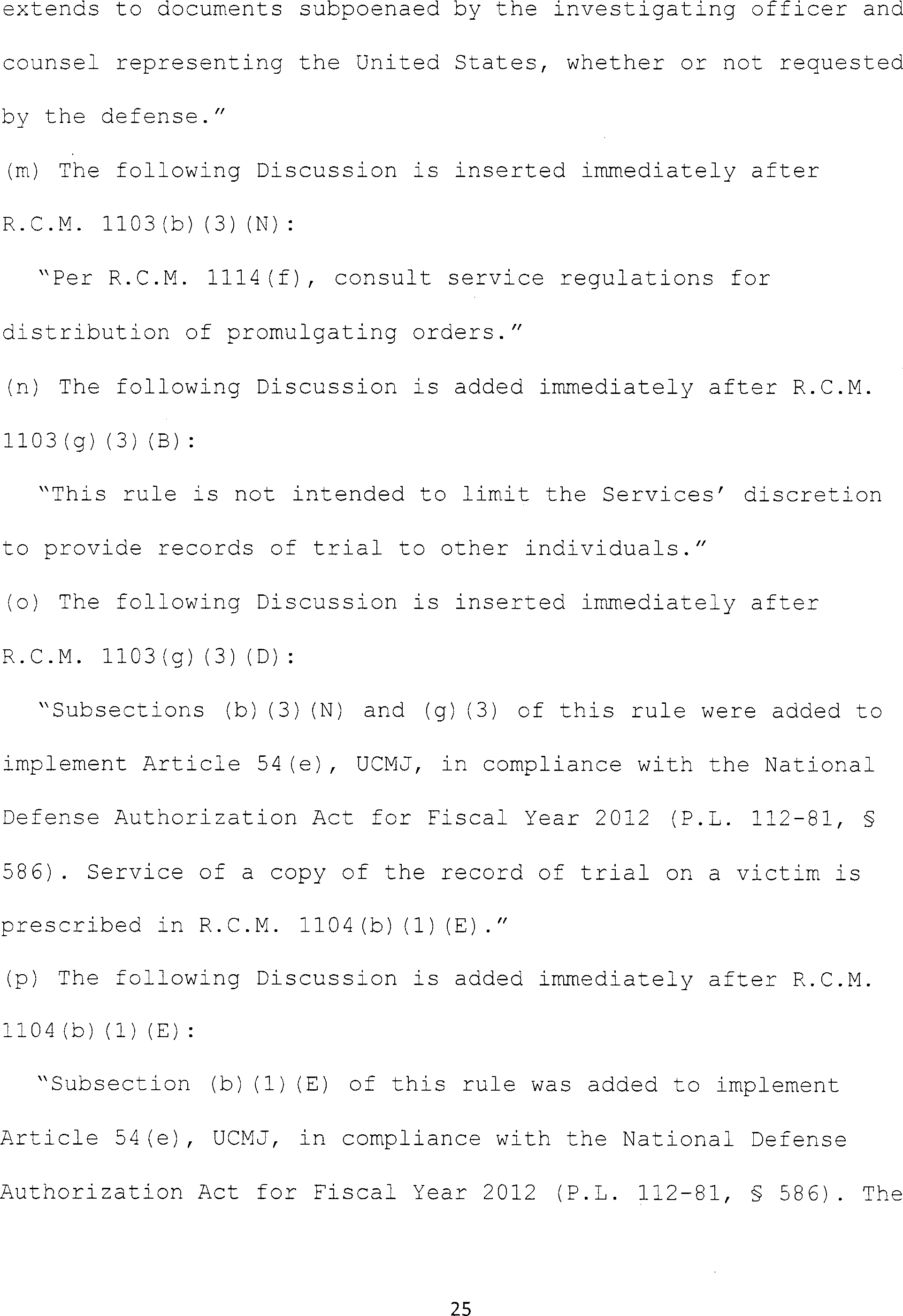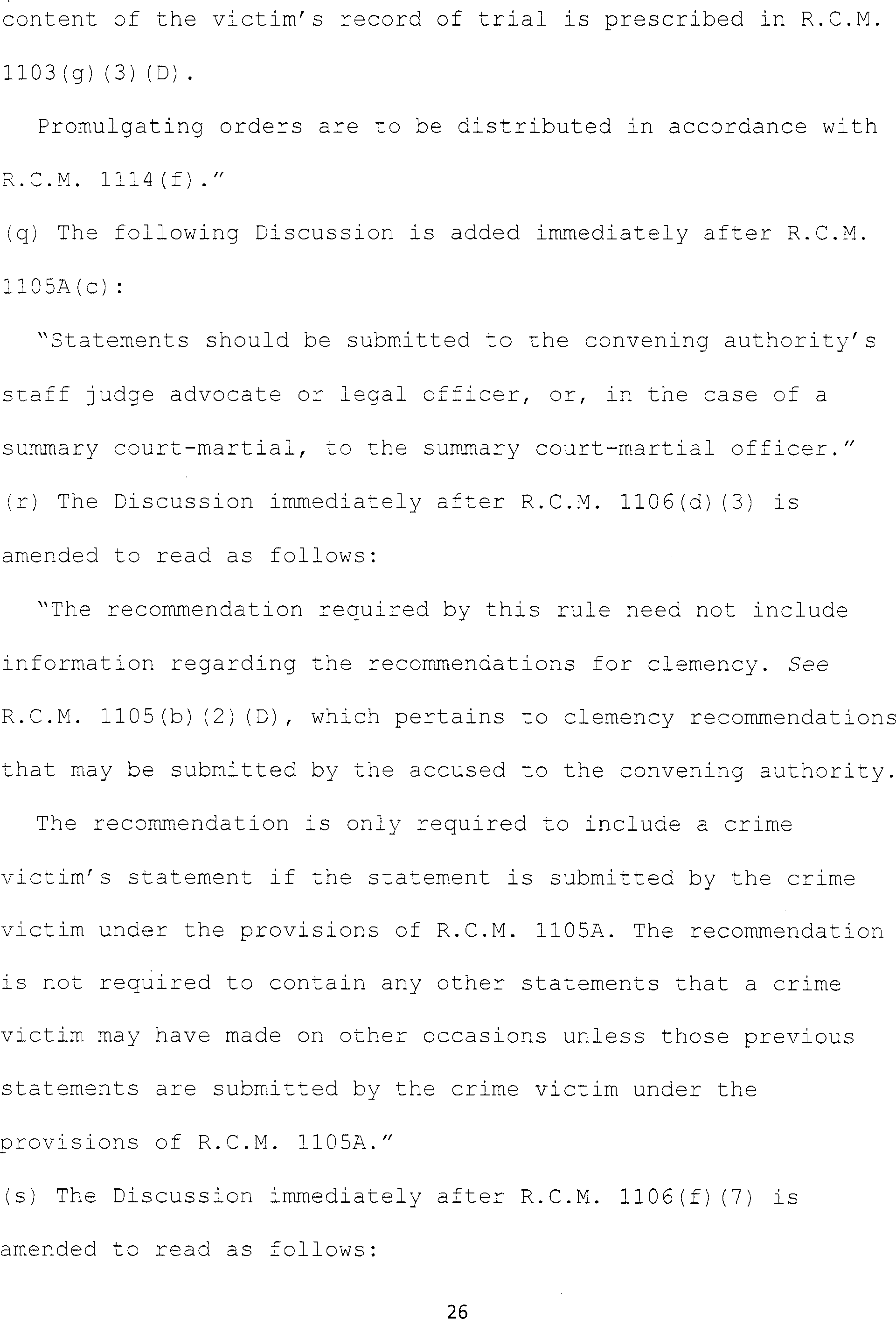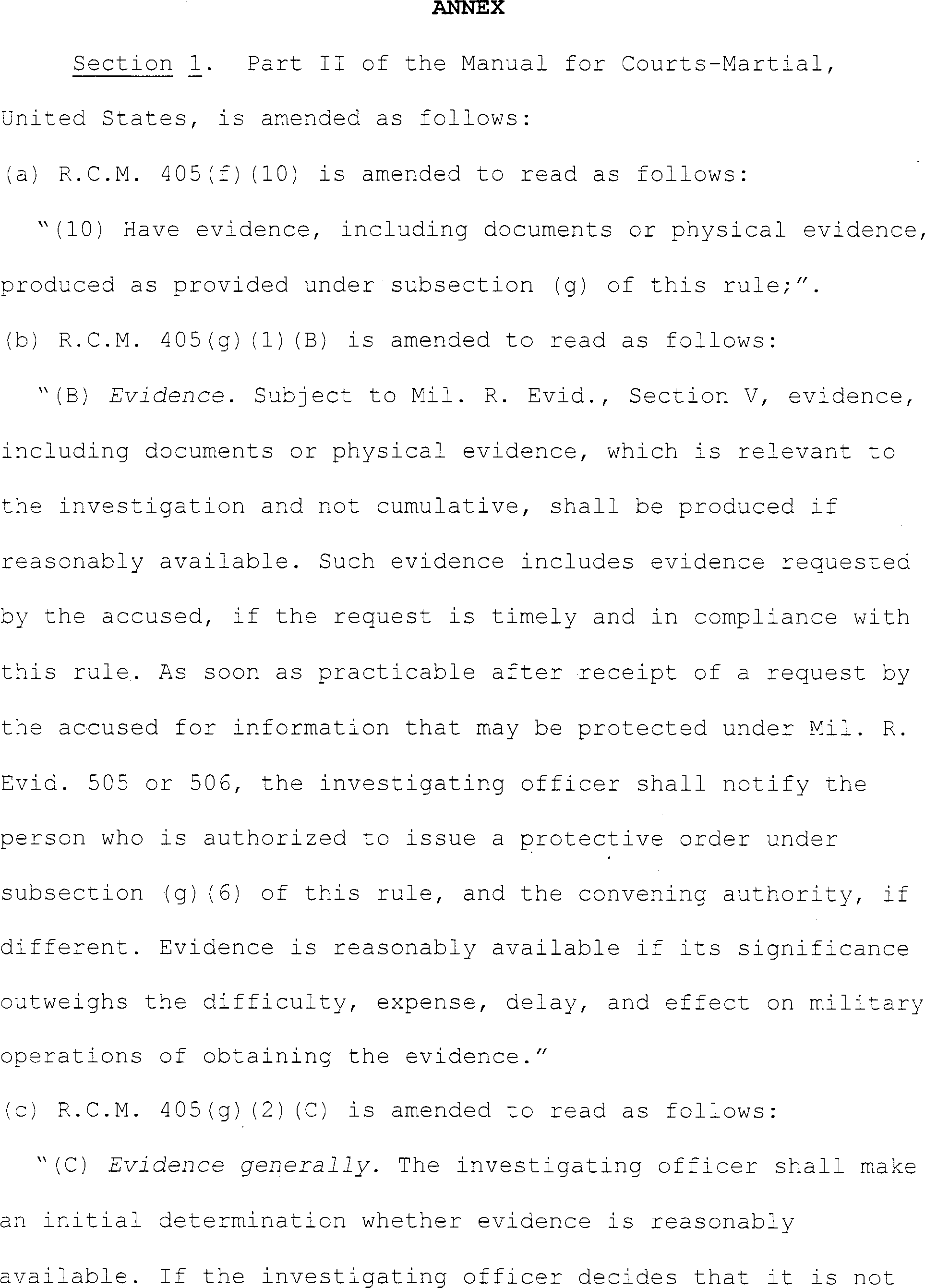 Section 1 . Part II, the Discussion for Part II, and the Analysis for Part II of the Manual for Courts-Martial, United States, are amended as described in the Annex attached and made a part of this order.