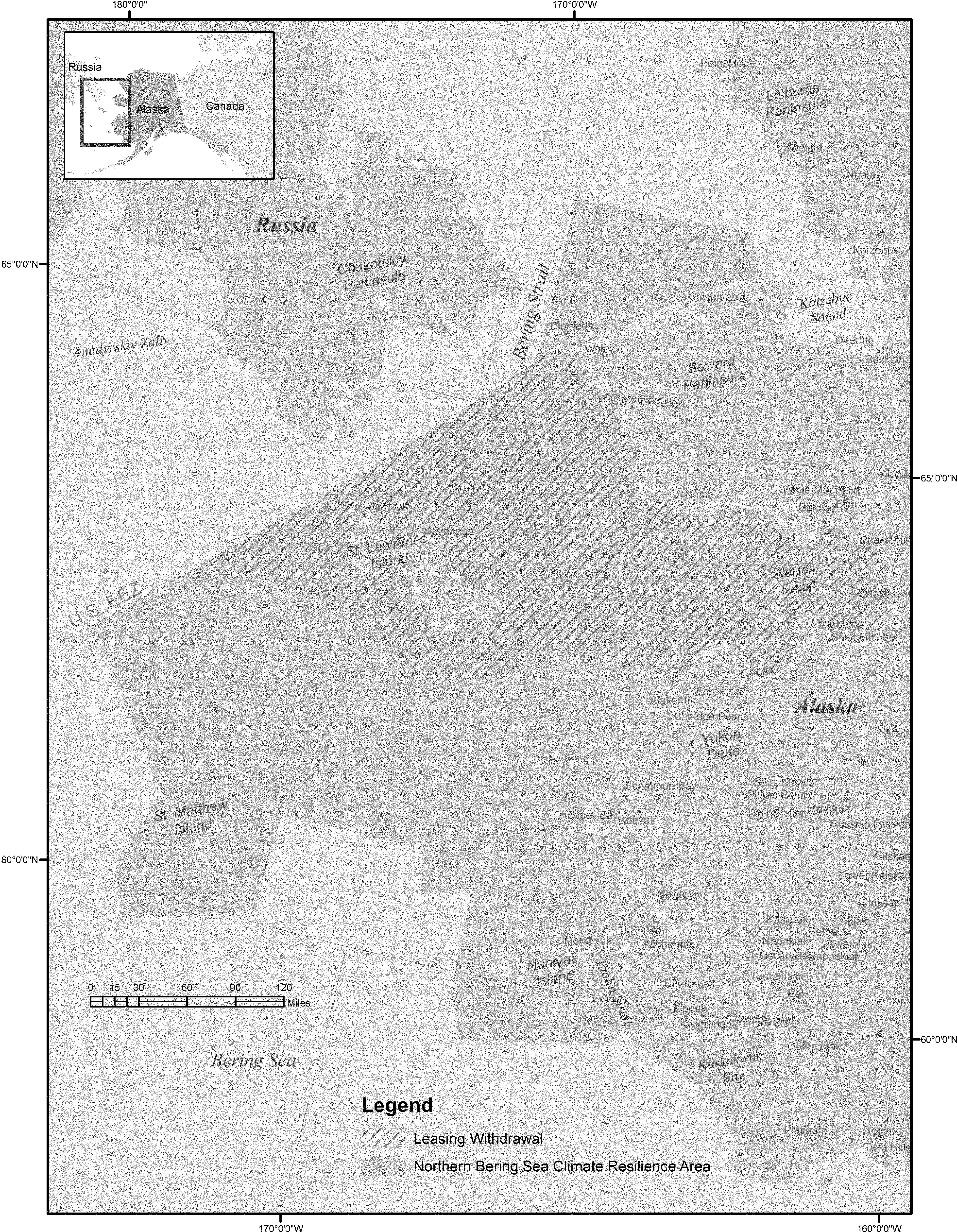 Sec. 3 . Withdrawal. Under the authority granted to me in section 12(a) of the Outer Continental Shelf Lands Act, 43 U.S.C. 1341(a), I hereby withdraw from disposition by leasing for a time period without specific expiration the following areas of the Outer Continental Shelf: (1) the area currently designated by the Bureau of Ocean Energy Management as the Norton Basin Planning Area; and (2) the Outer Continental Shelf lease blocks within the Bureau of Ocean Energy Management's St. Matthew-Hall Planning Area lying within 25 nautical miles of St. Lawrence Island. The boundaries of the withdrawn areas are more specifically delineated in the attached map and, with respect to the St. Matthew-Hall Planning Area, the accompanying table of withdrawn Outer Continental Shelf lease blocks. Both the map and table form a part of this order, with the table governing the withdrawal and withdrawal boundaries within the St. Matthew-Hall Planning Area. This withdrawal prevents consideration of these areas for future oil or gas leasing for purposes of exploration, development, or production. This withdrawal furthers the principles of responsible public stewardship entrusted to this office and takes due consideration of the importance of the withdrawn area to Alaska Native tribes, wildlife, and wildlife habitat, and the need for regional resiliency in the face of climate change. Nothing in this withdrawal affects rights under existing leases in the withdrawn areas.