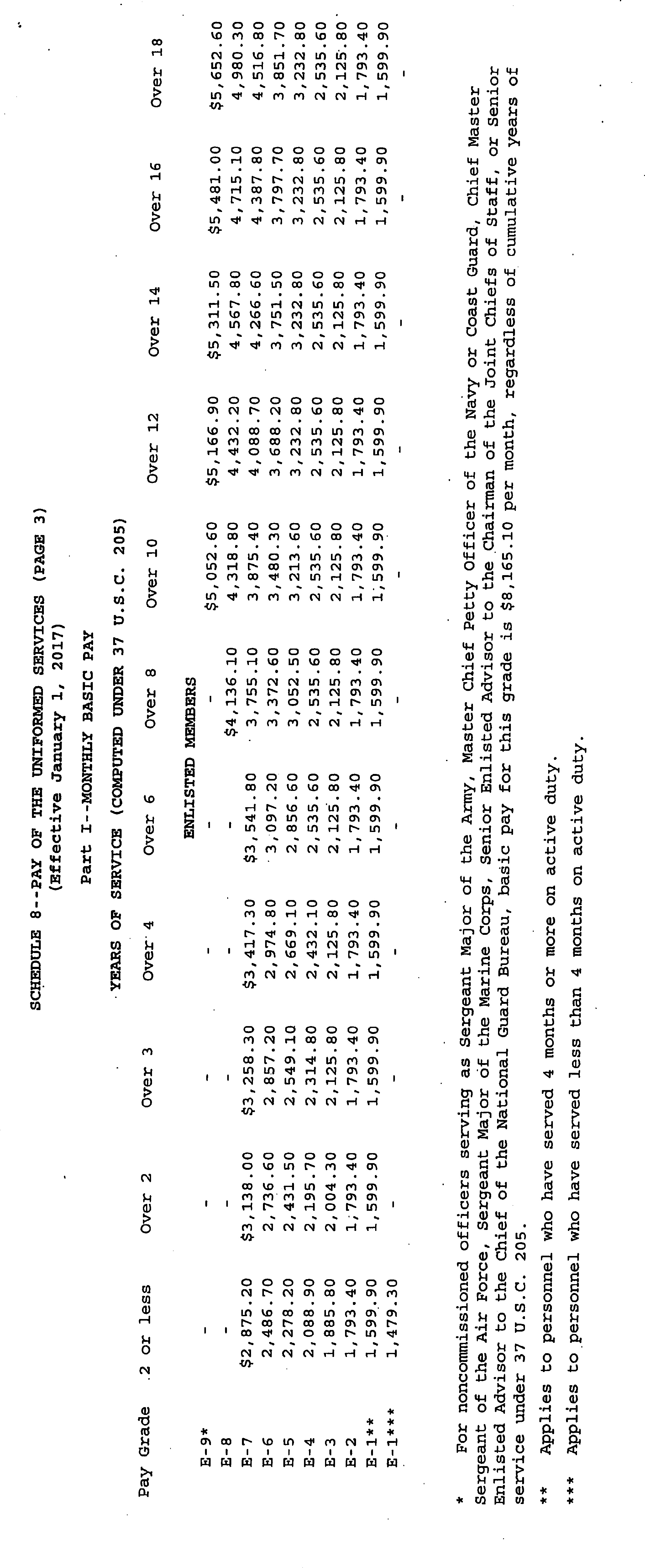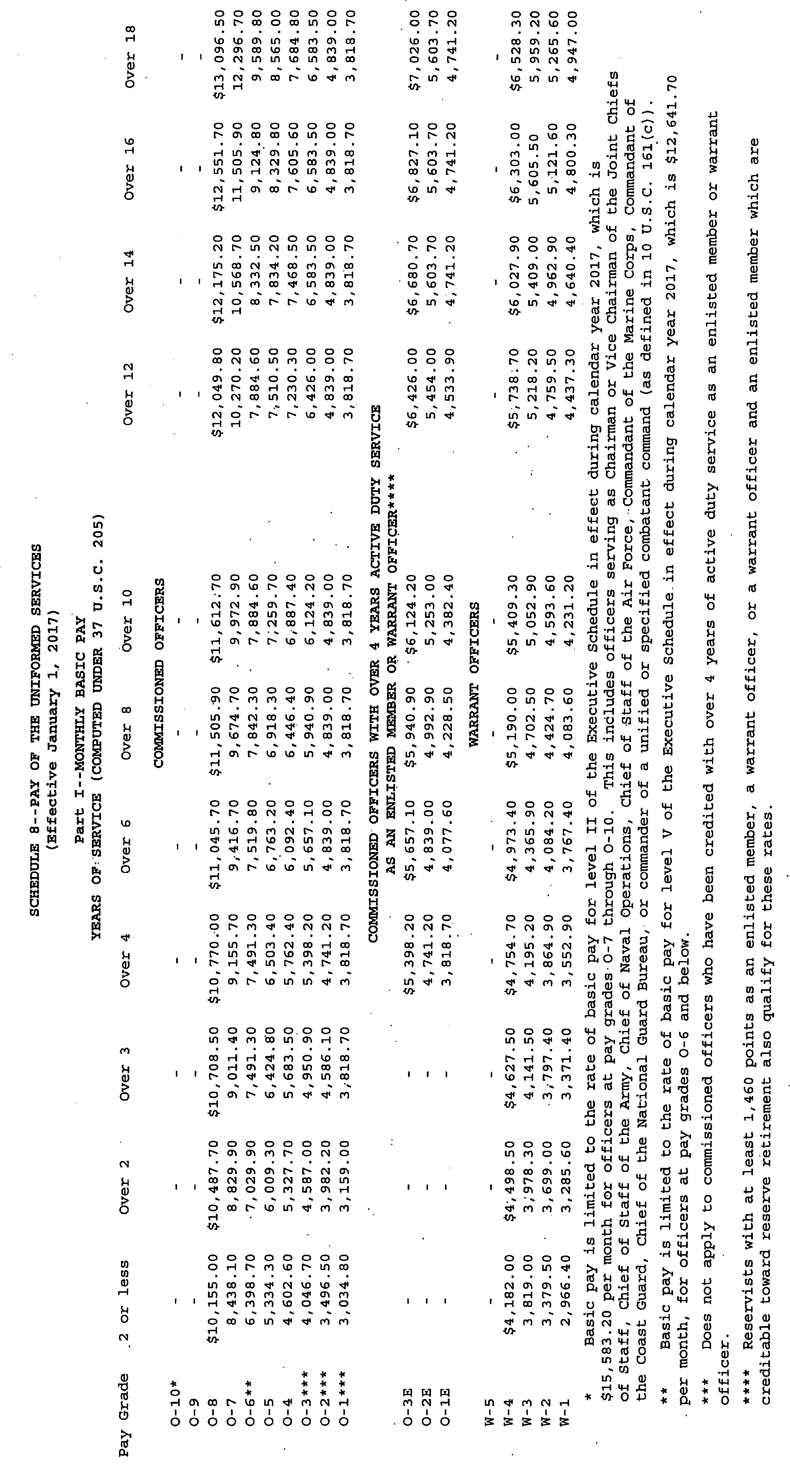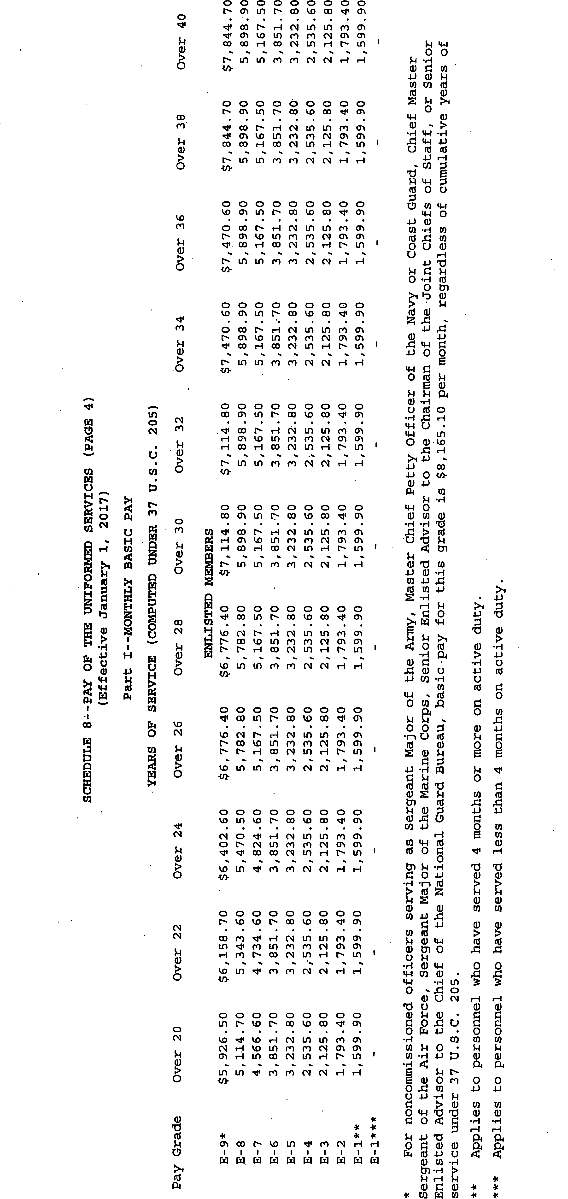 Sec. 4 . Uniformed Services. The rates of monthly basic pay (37 U.S.C. 203(a)) for members of the uniformed services, as adjusted under section 601 of the National Defense Authorization Act for Fiscal Year 2017, [S. 2943, 114th Cong. (2016)], as signed by the President on December 23, 2016, and the rate of monthly cadet or midshipman pay (37 U.S.C. 203(c)) are set forth on Schedule 8 attached hereto and made a part hereof.