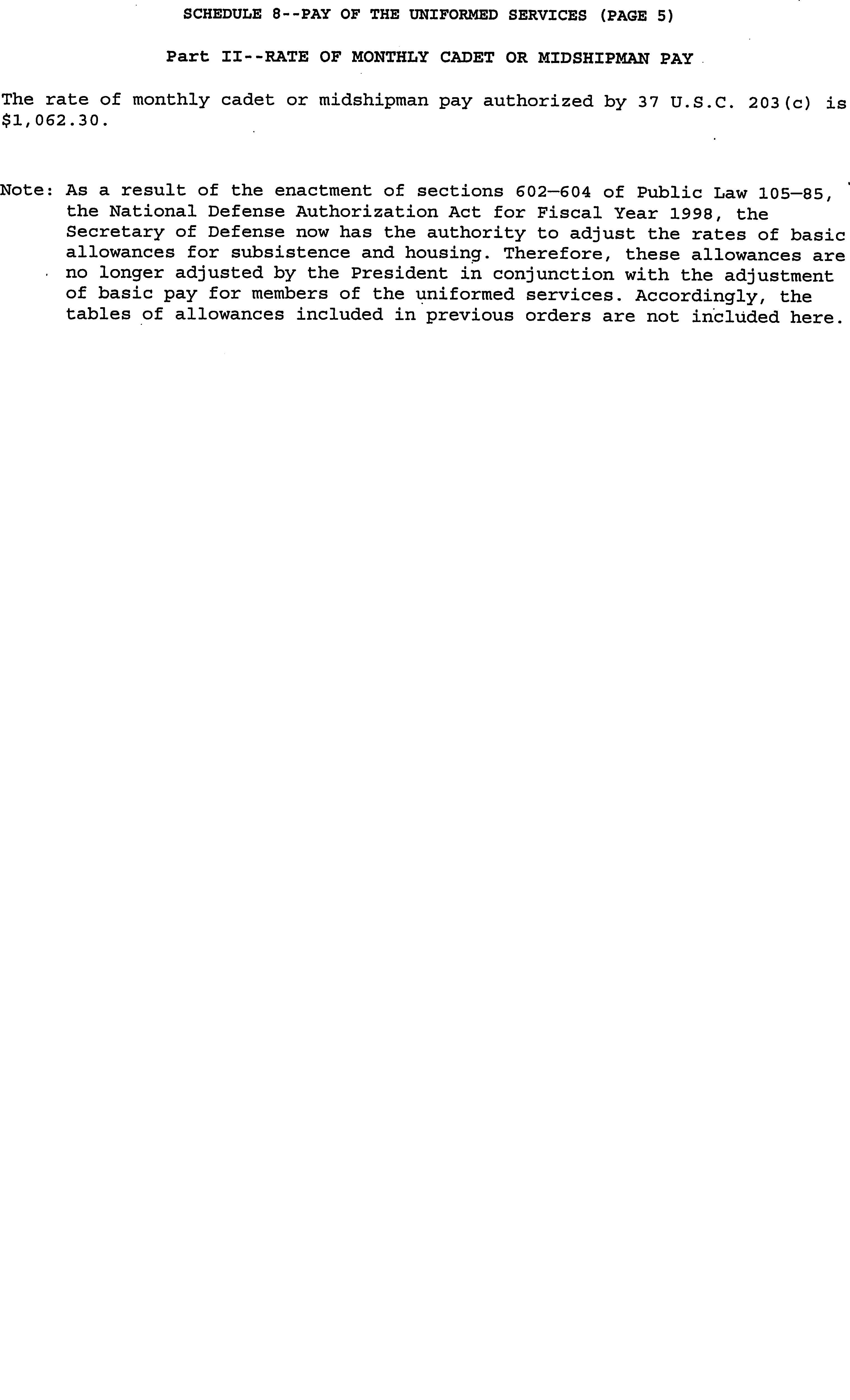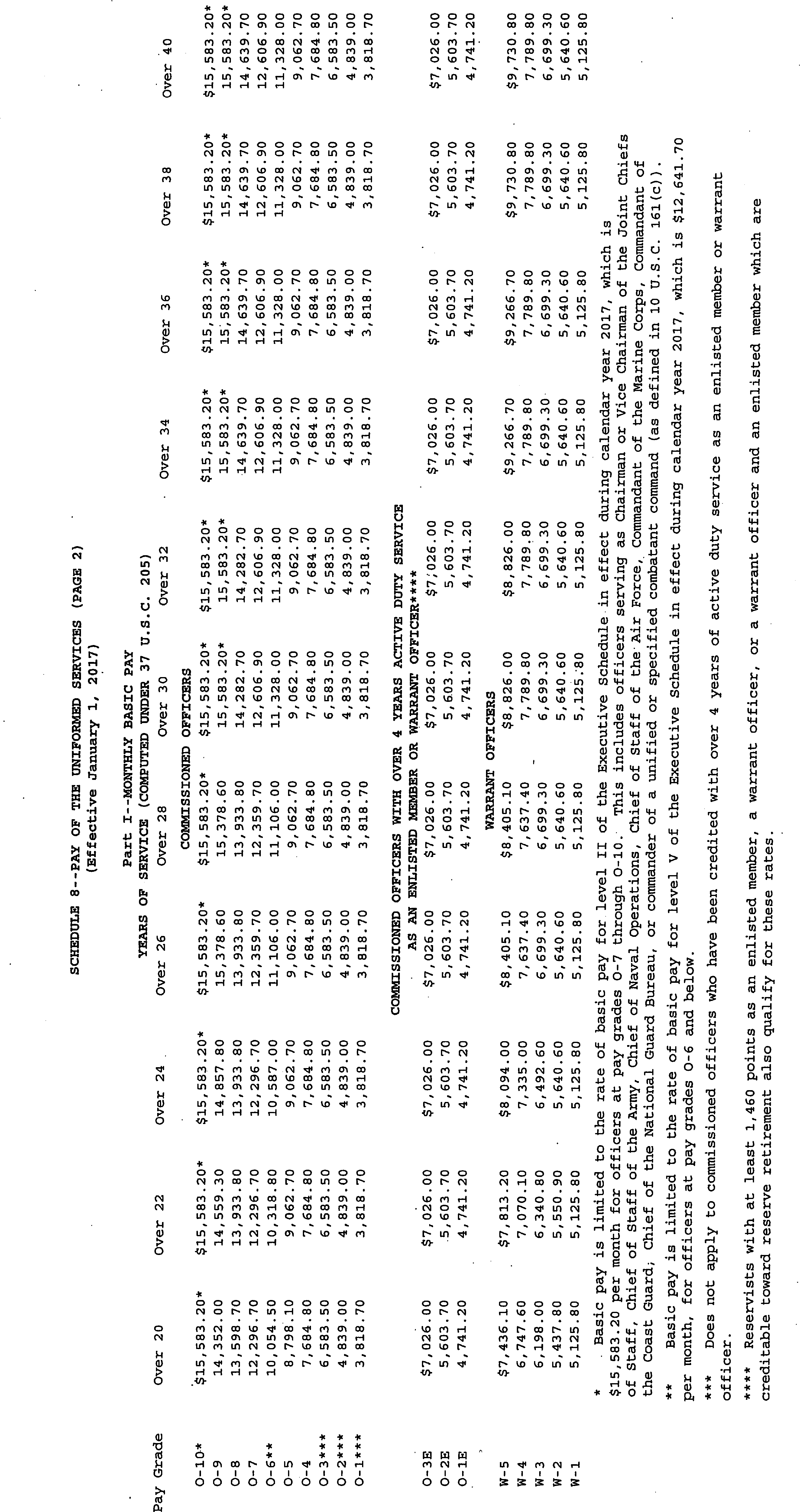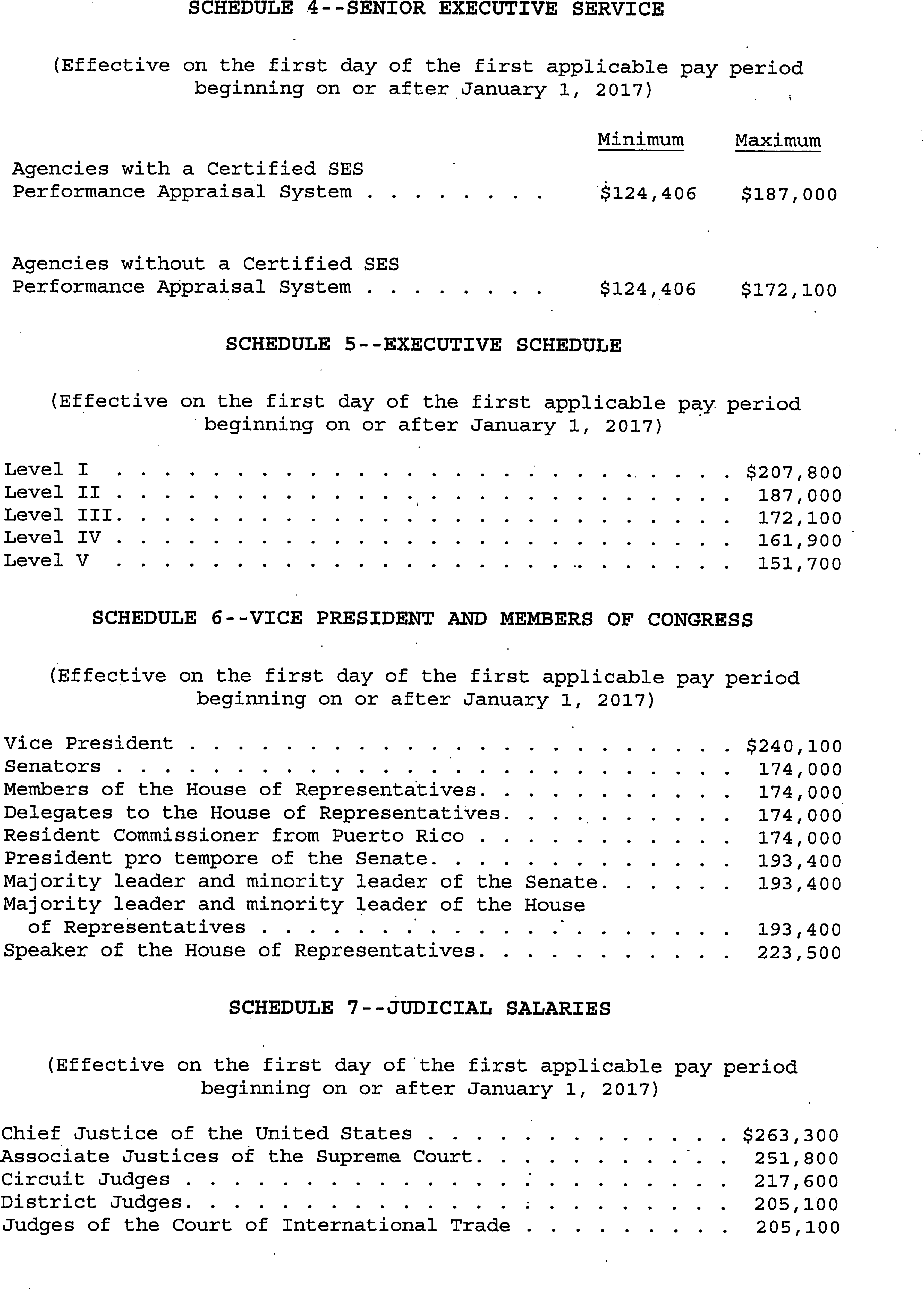 Sec. 4 . Uniformed Services. The rates of monthly basic pay (37 U.S.C. 203(a)) for members of the uniformed services, as adjusted under section 601 of the National Defense Authorization Act for Fiscal Year 2017, [S. 2943, 114th Cong. (2016)], as signed by the President on December 23, 2016, and the rate of monthly cadet or midshipman pay (37 U.S.C. 203(c)) are set forth on Schedule 8 attached hereto and made a part hereof.