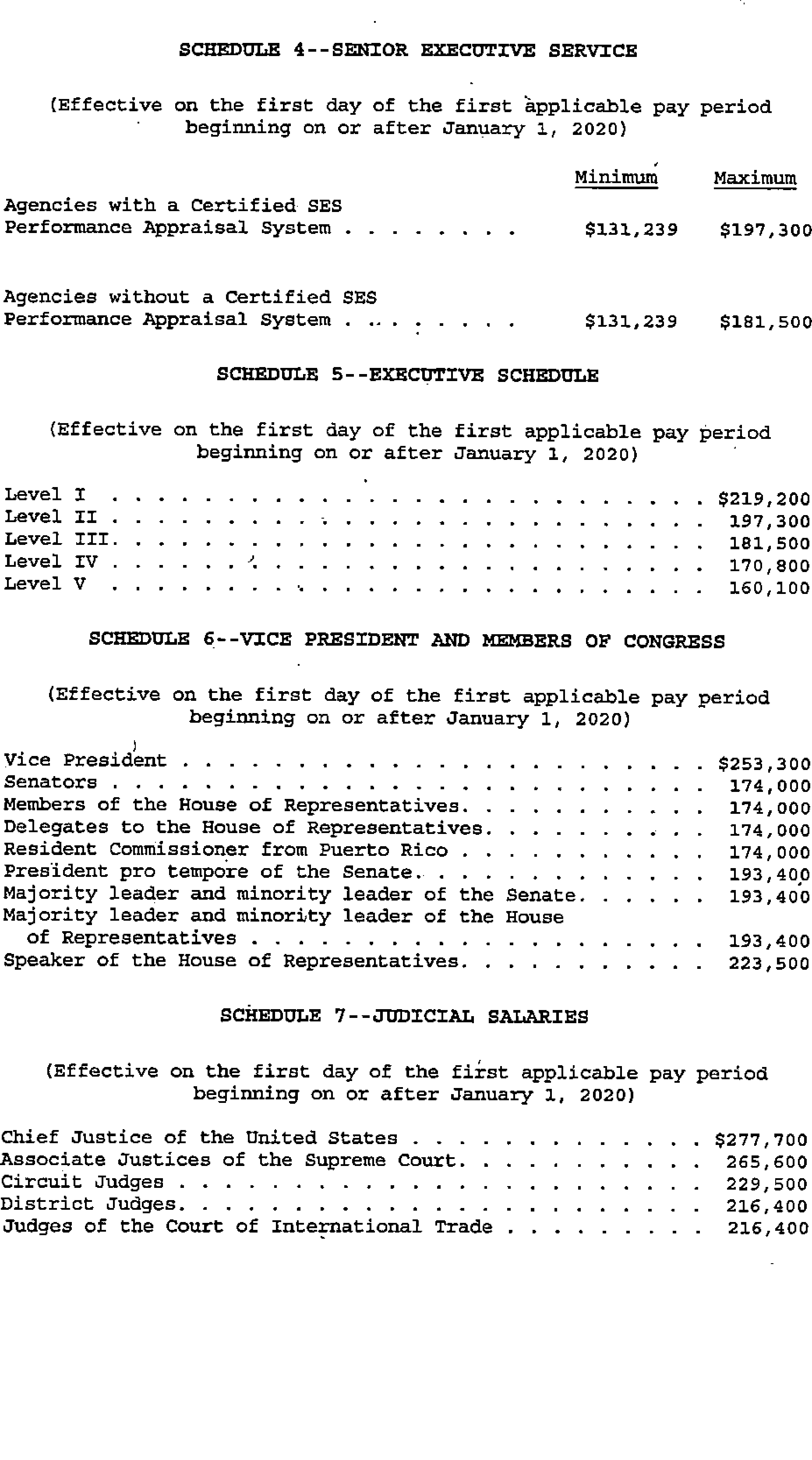 Section 1. Statutory Pay Systems. The rates of basic pay or salaries of the statutory pay systems (as defined in 5 U.S.C. 5302(1)), as adjusted under 5 U.S.C. 5303 and section 748 of division C of the Consolidated Appropriations Act, 2020, are set forth on the schedules attached hereto and made a part hereof: