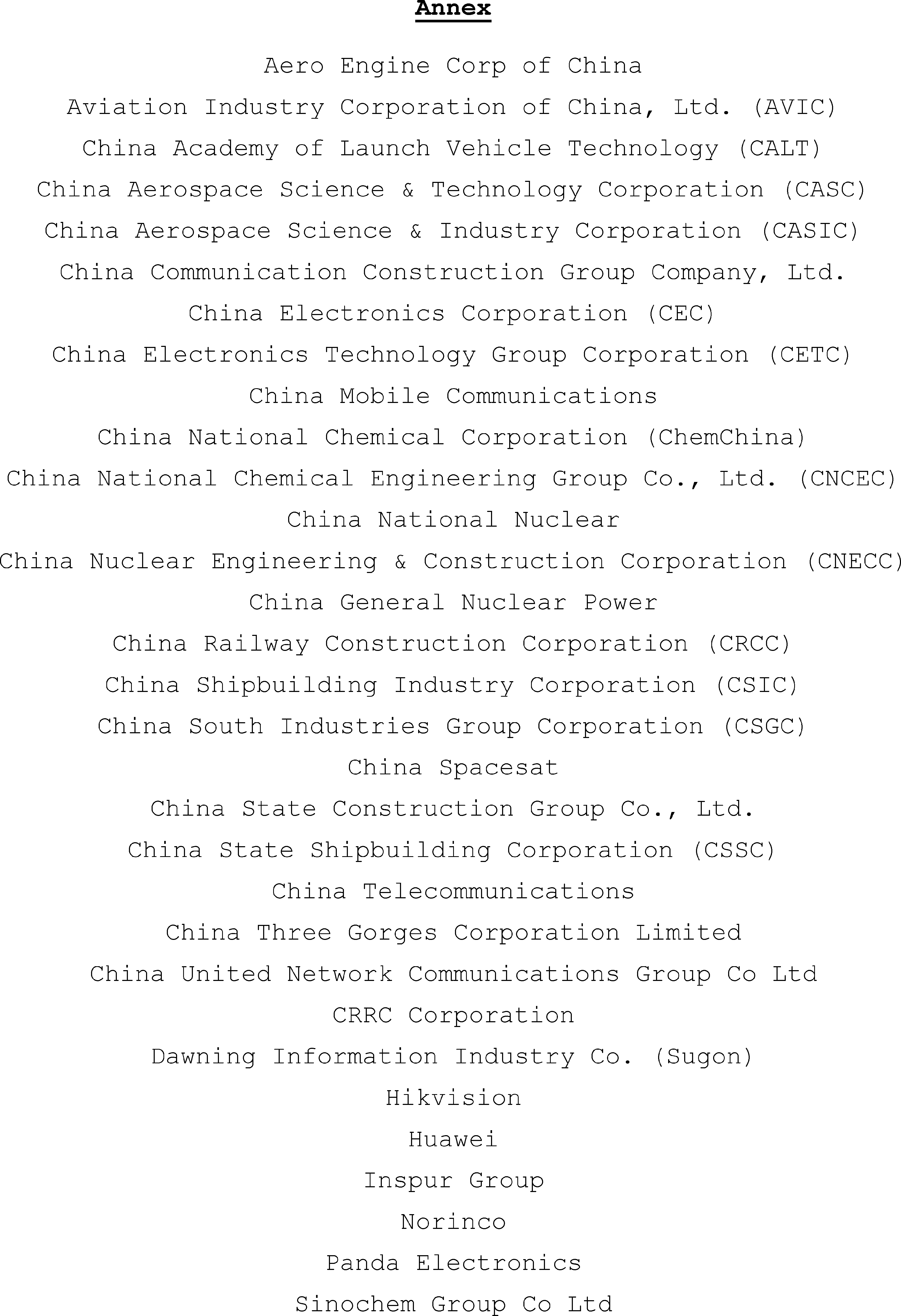 (i) any person that the Secretary of Defense has listed as a Communist Chinese military company operating directly or indirectly in the United States or in any of its territories or possessions pursuant to section 1237 of Public Law 105-261, as amended by section 1233 of Public Law 106-398 and section 1222 of Public Law 108-375, as of the date of this order, and as set forth in the Annex to this order, until such time as the Secretary of Defense removes such person from such list;