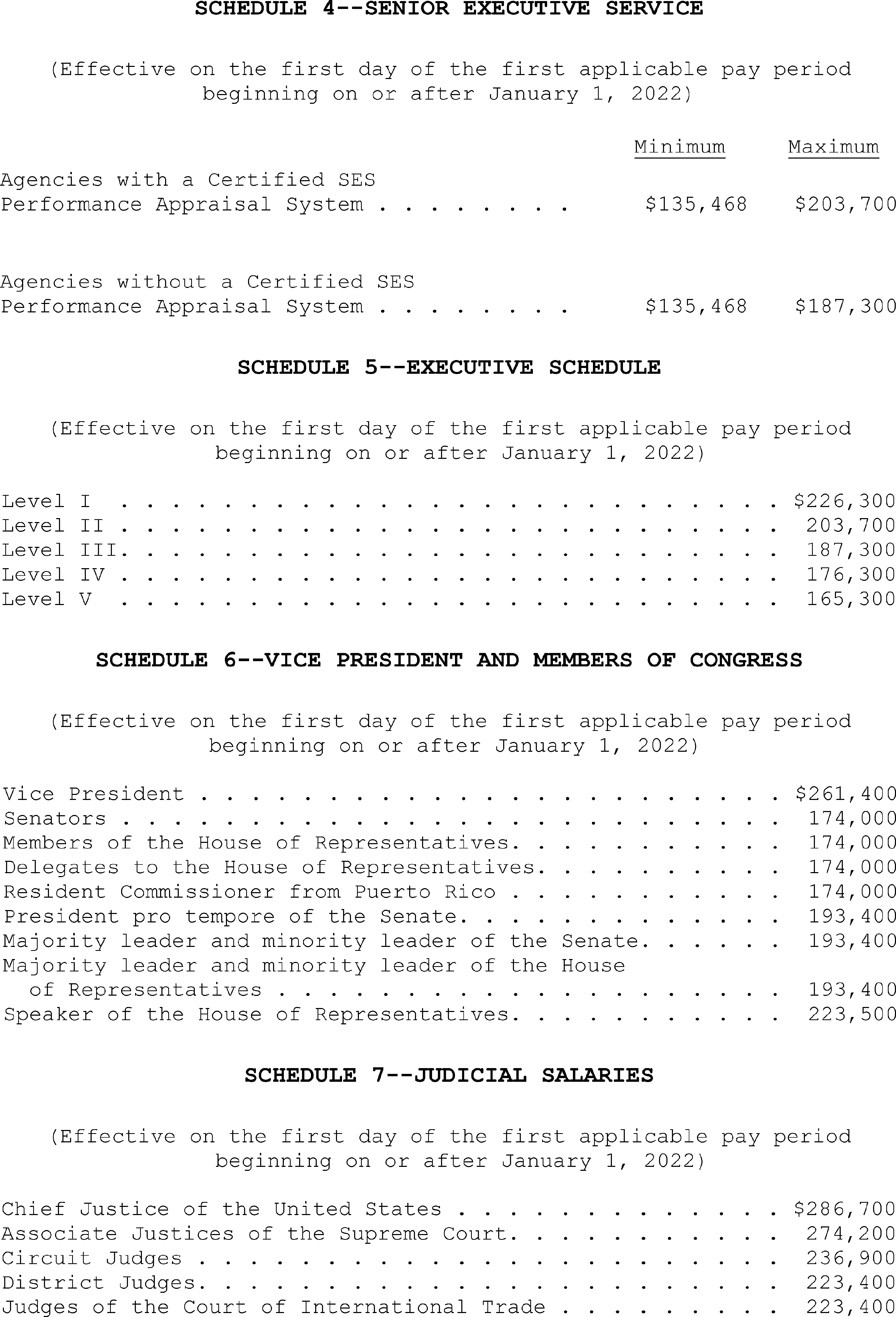 Sec. 2. Senior Executive Service. The ranges of rates of basic pay for senior executives in the Senior Executive Service, as established pursuant to 5 U.S.C. 5382, are set forth on Schedule 4 attached hereto and made a part hereof.