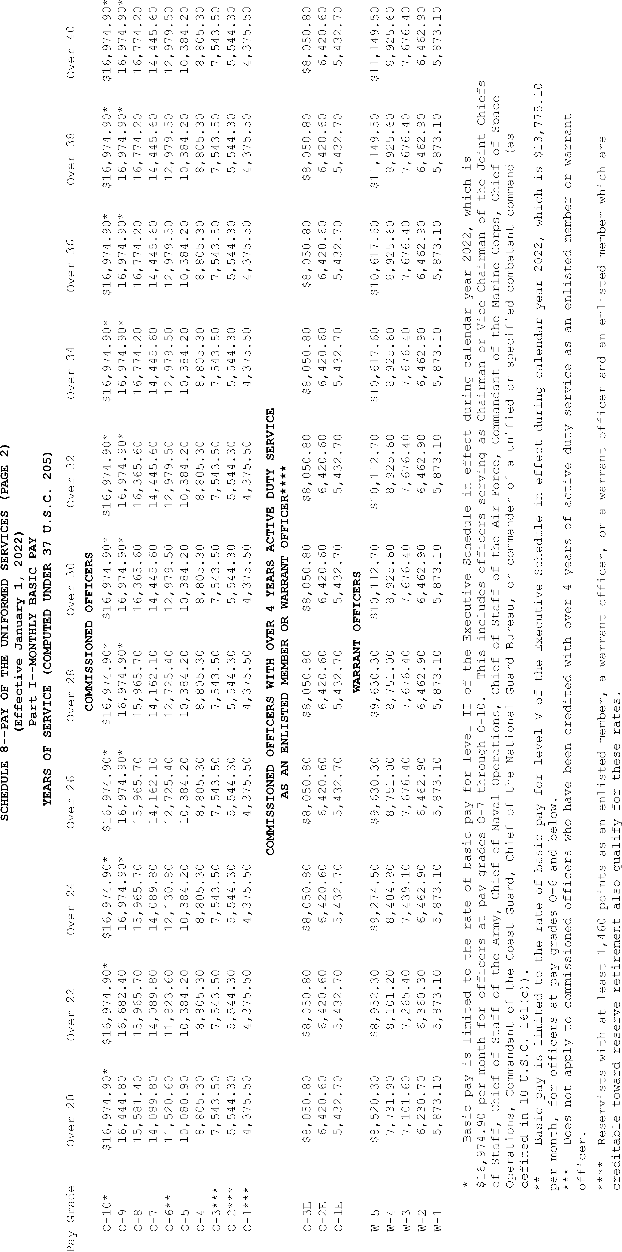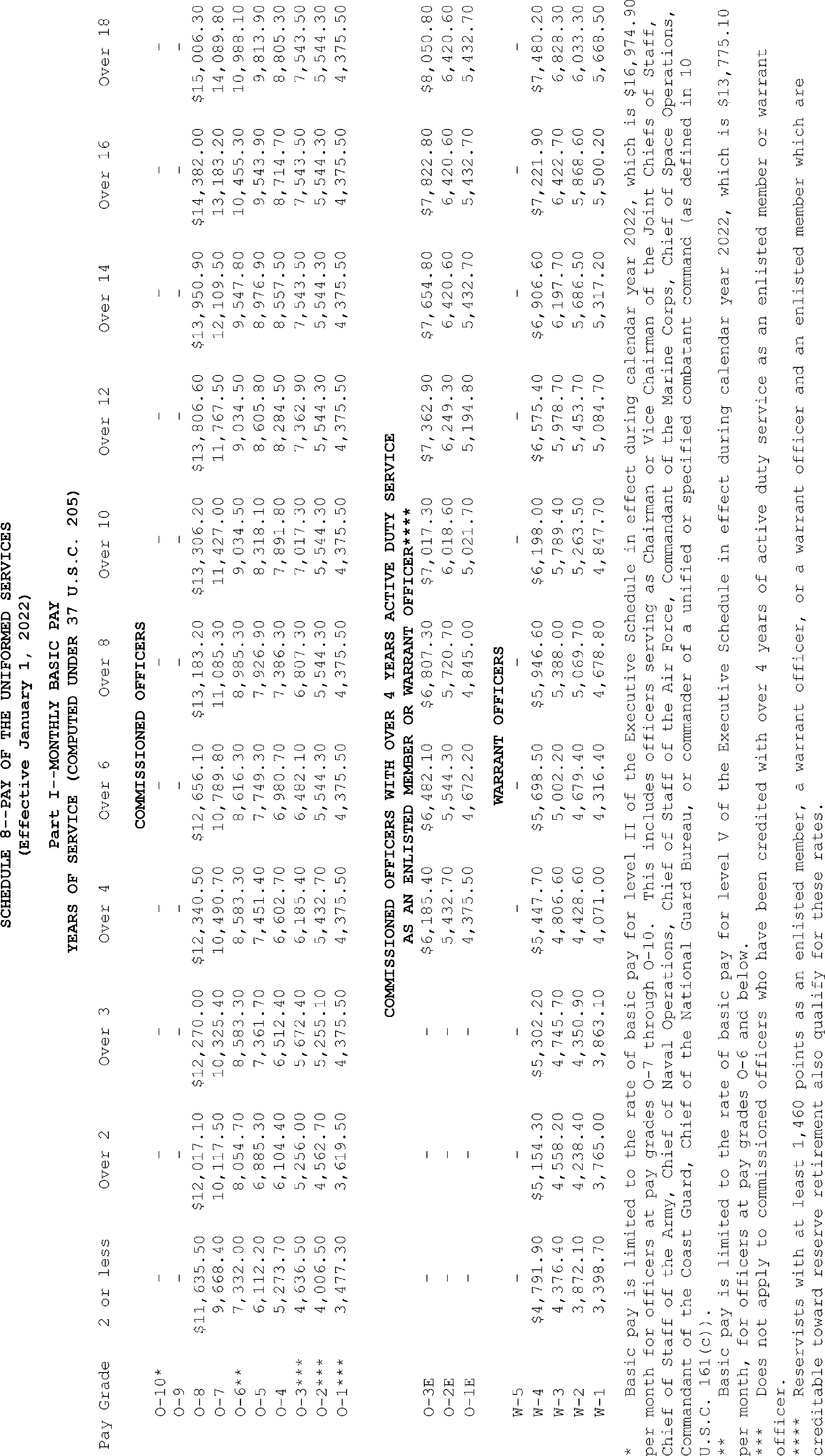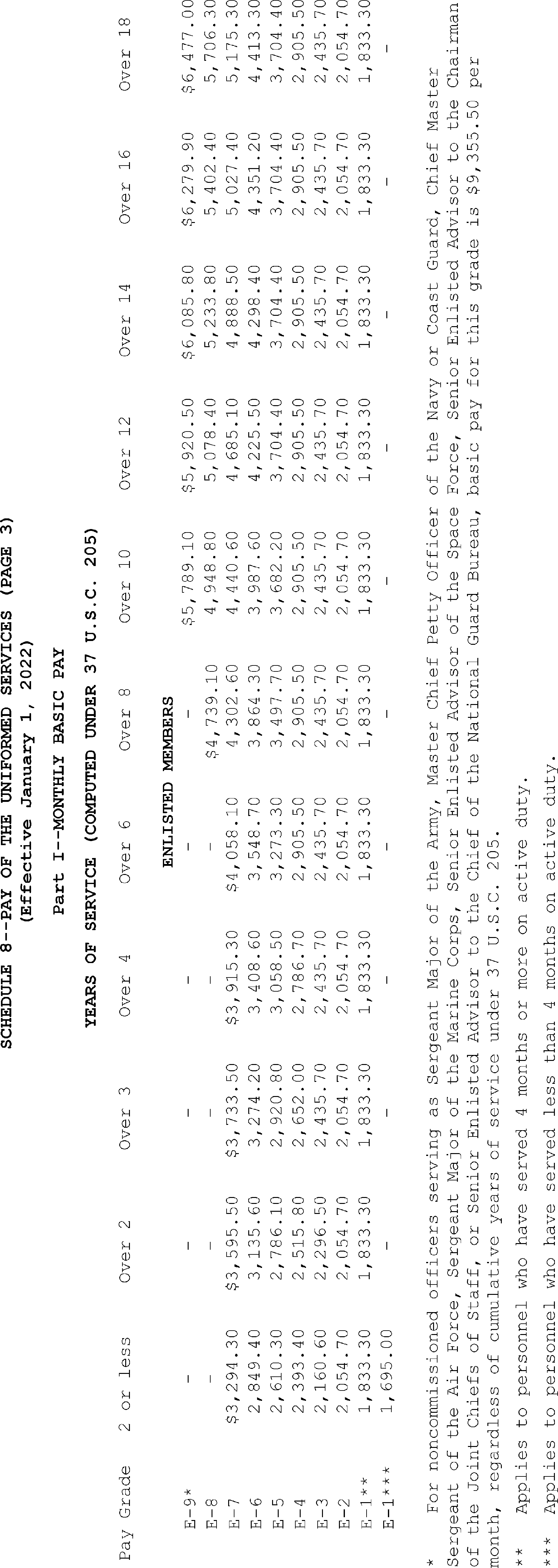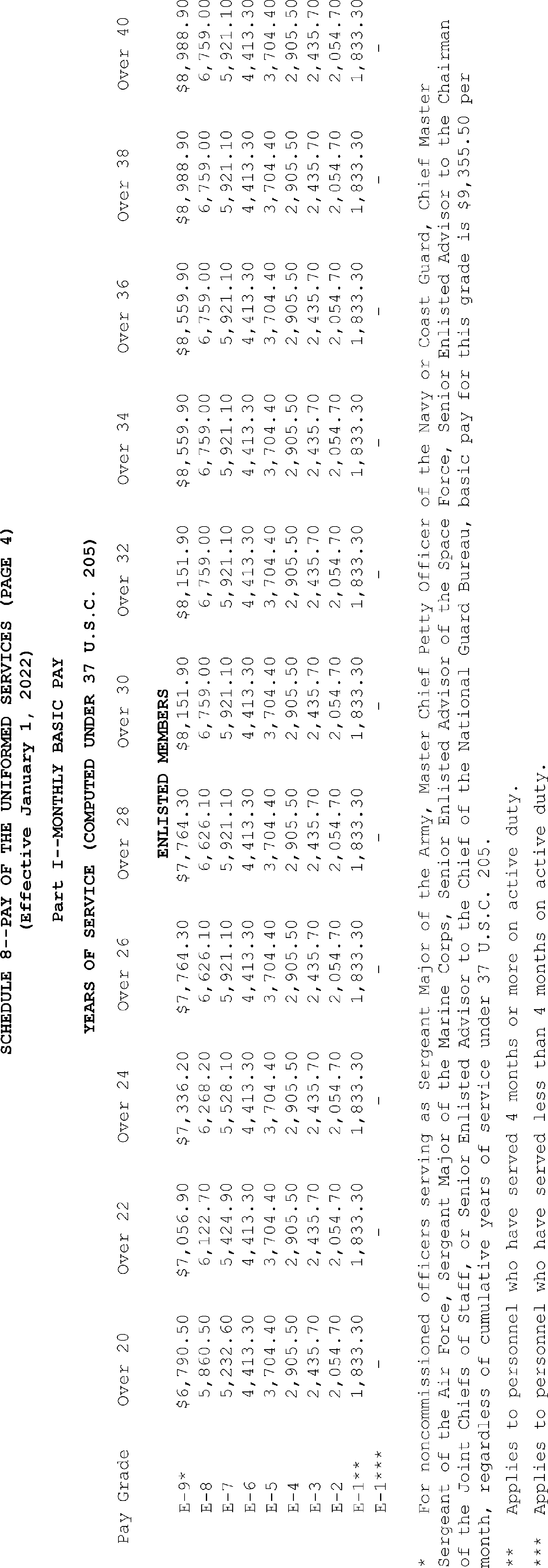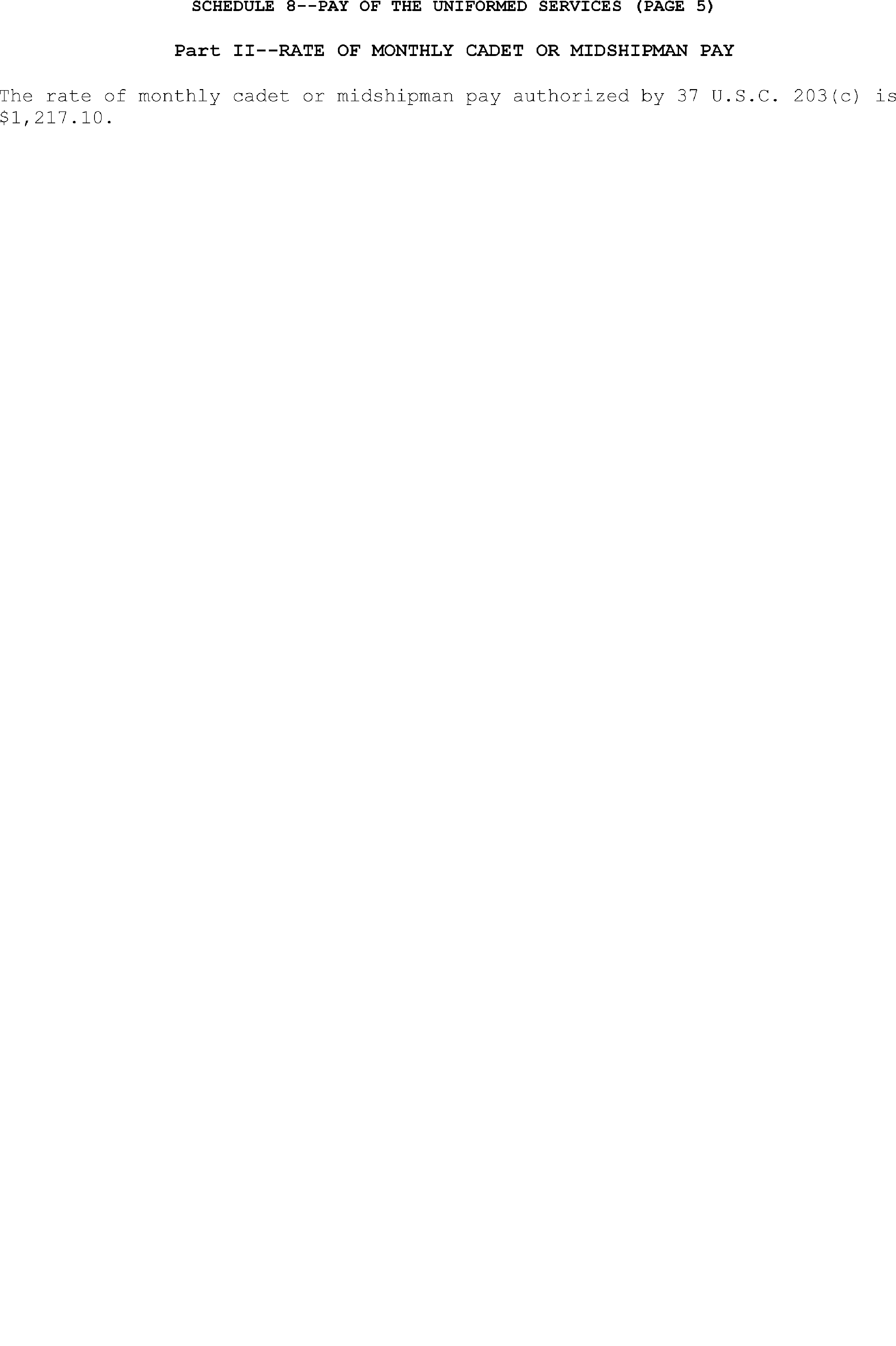 Sec. 4. Uniformed Services. The rates of monthly basic pay (37 U.S.C. 203(a)) for members of the uniformed services, as adjusted under 37 U.S.C. 1009, and the rate of monthly cadet or midshipman pay (37 U.S.C. 203(c)) are set forth on Schedule 8 attached hereto and made a part hereof.